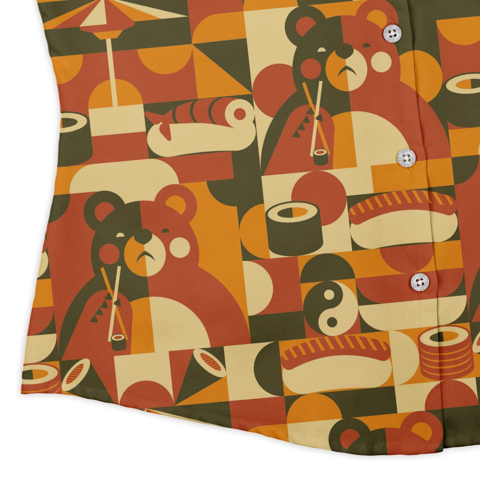 Meet the Sushi Eating Bear Anime Curvy Button Up Shirt: a cheeky, allover pattern of anime-style bears blissfully snacking on sushi, designed by Tobe Fonseca. Tailored for curves with a clean, untucked-ready vibe, it brings gallery art to everyday nerd life. The print flows right across the pocket for a seamless finish, and eco-conscious inks keep the colors vivid. Artist-backed, playful, and effortlessly wearable.