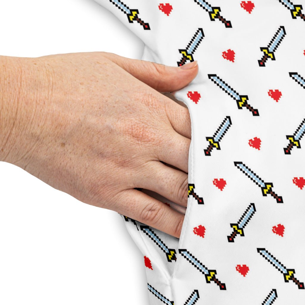Meet the Sword And Hearts Video Game Dress—level up your daywear with an arcade-chic pattern of crisp swords and life hearts in an all-over repeat. Smooth, comfy, and ready for quests IRL, it nails laid-back polish for brunch, cons, or casual raids. Designed by Heather Davenport and finished with yes-there-are-pockets convenience, it keeps your hands free for controllers, snacks, or victory poses.