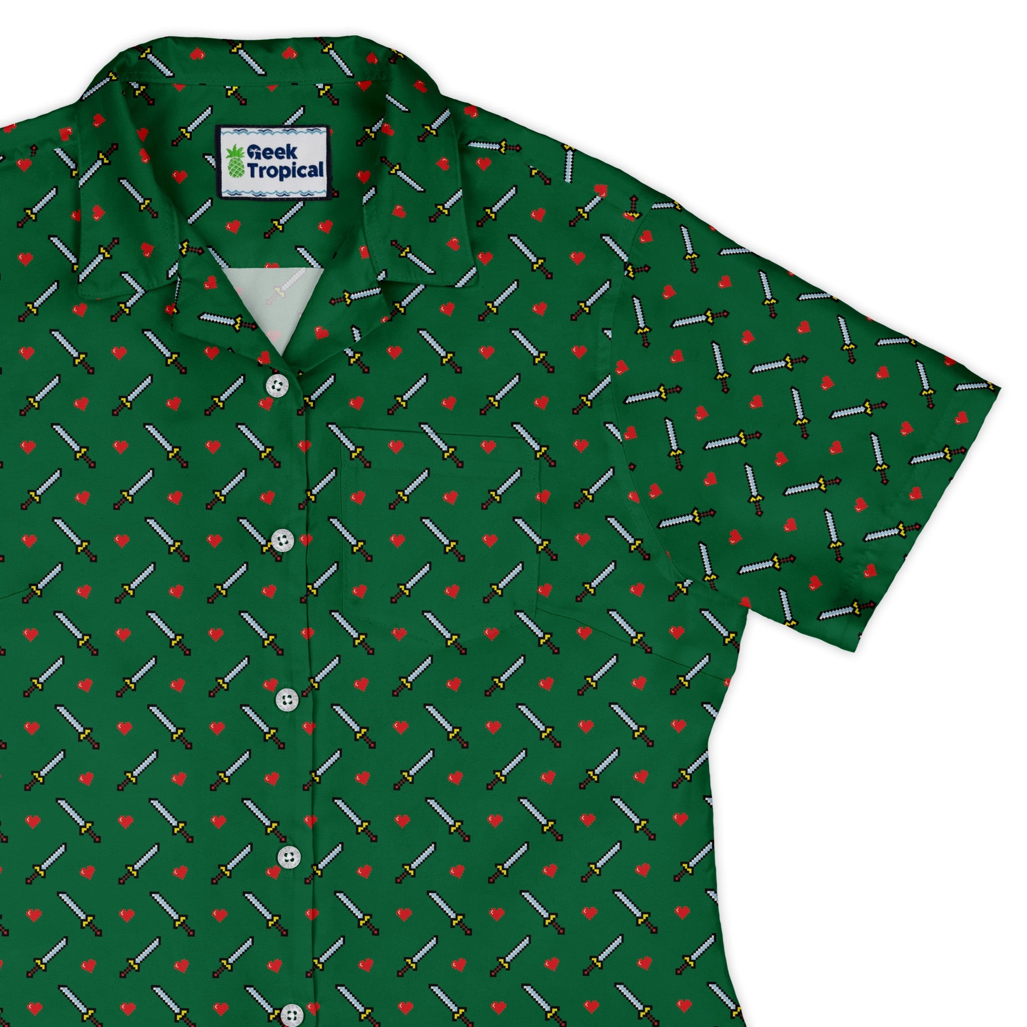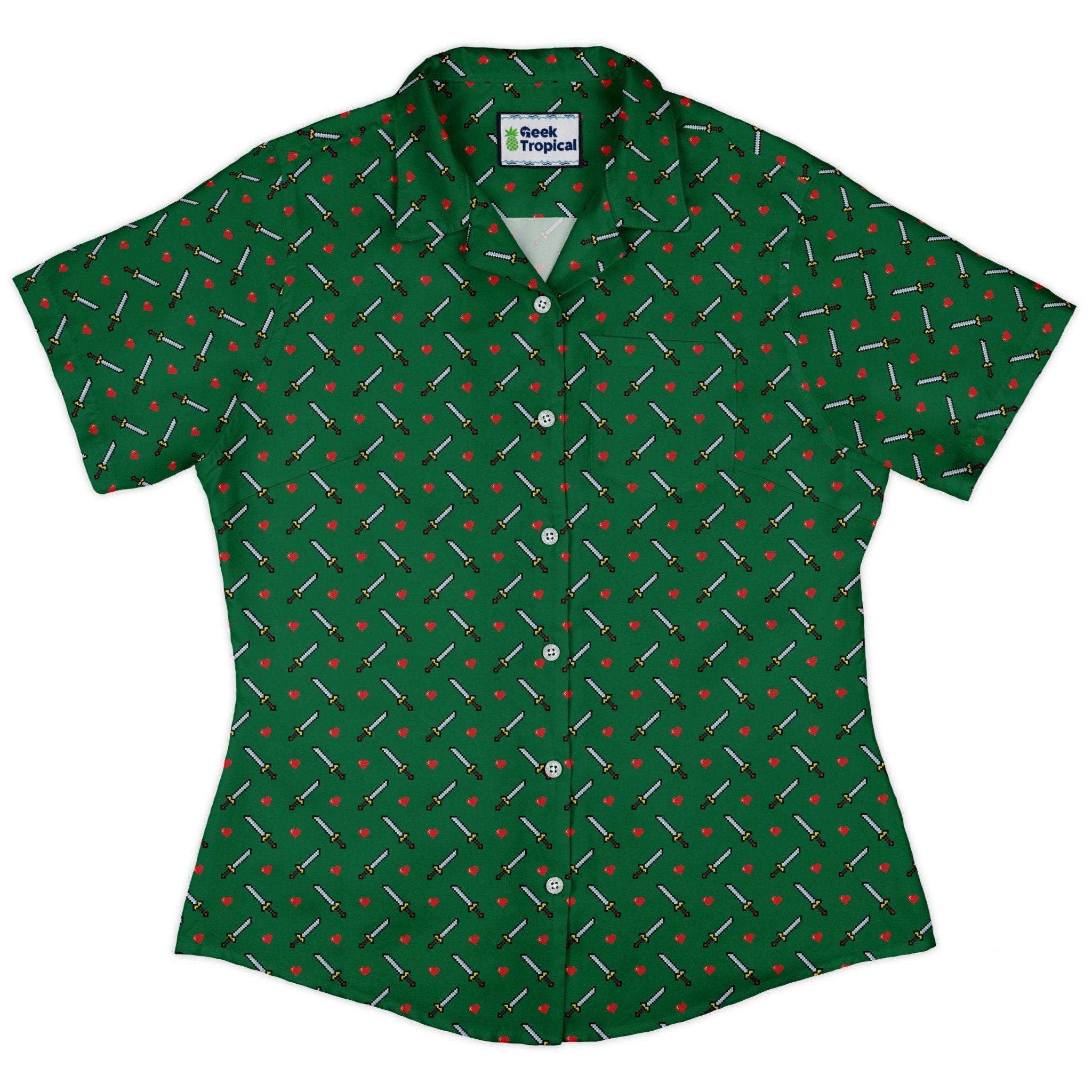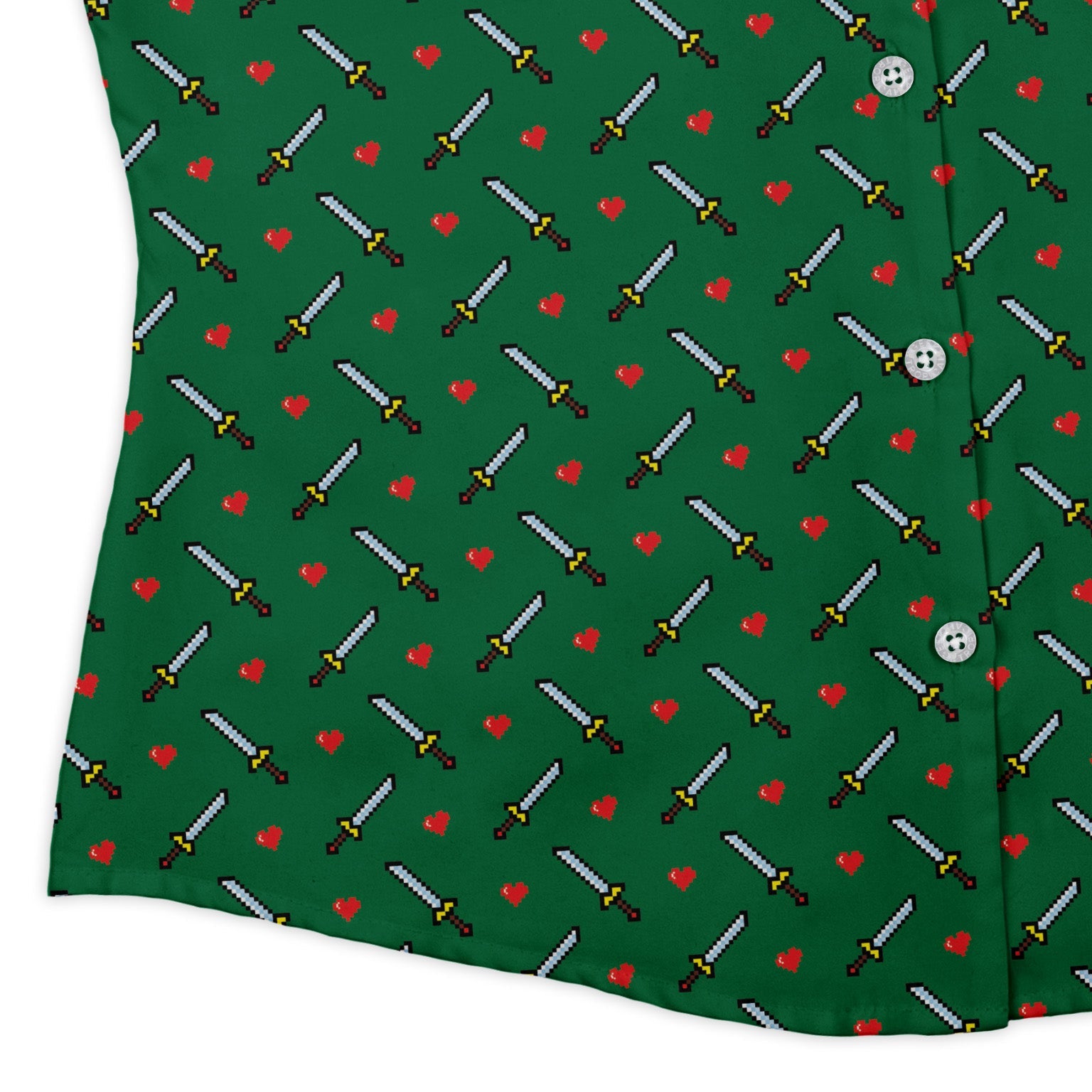 Sword and hearts video game green Curvy Button Up Shirt brings retro arcade energy with a curve-forward fit. On an emerald field, pixel hearts and swords repeat in a sprite-style grid. The print aligns across placket and pocket for an unbroken look. Tailored to flatter curves, it wears easy. Designed by Heather Davenport and printed with eco-conscious inks, this artist-backed piece levels up every outfit.