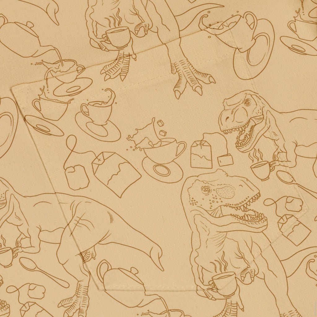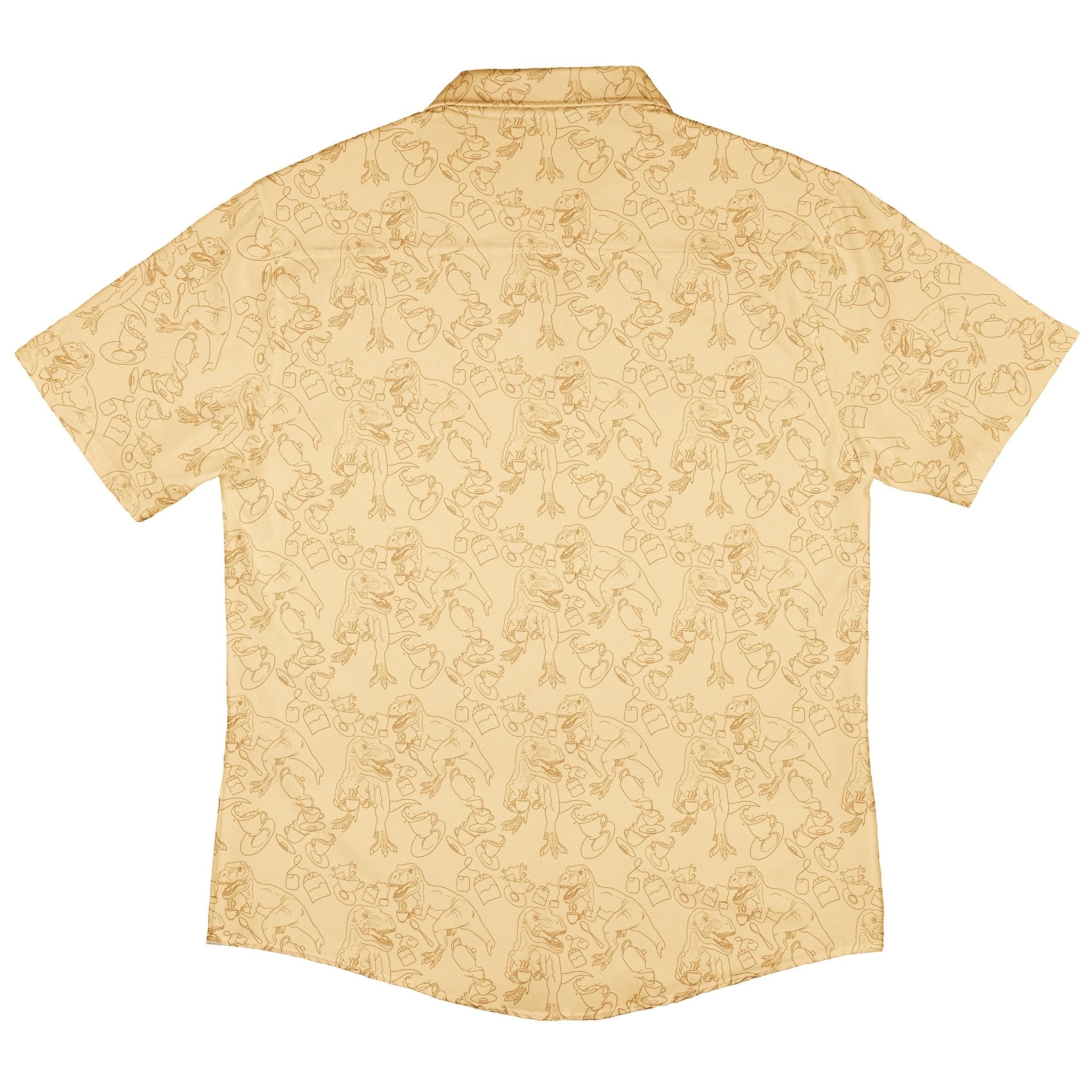 Tea Rex Button Up Shirt serves prehistoric charm with teatime manners. An all‑over T‑Rex at tea time keeps the joke clever, not loud, while clean linework and even spacing make the pattern read crisp from collar to hem. The front placket and optional pocket keep the artwork flowing, so the Rex never gets chopped. Designed by Julie Kitzes and artist‑backed, this is witty, wearable geek style you can dress up or down.