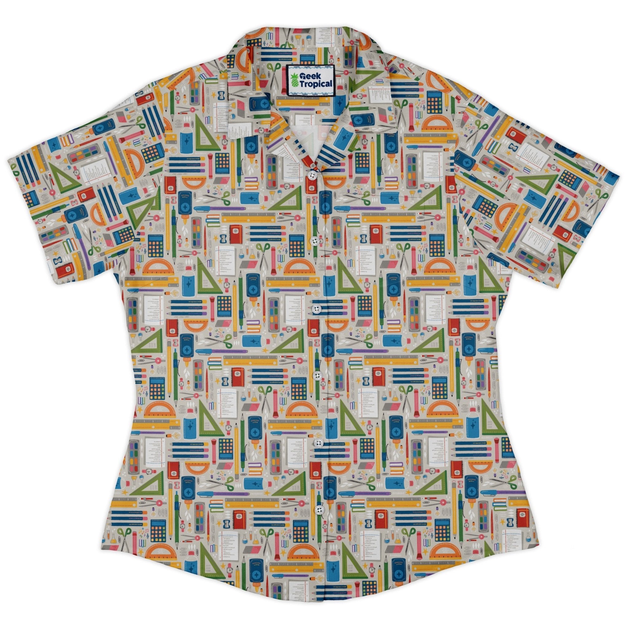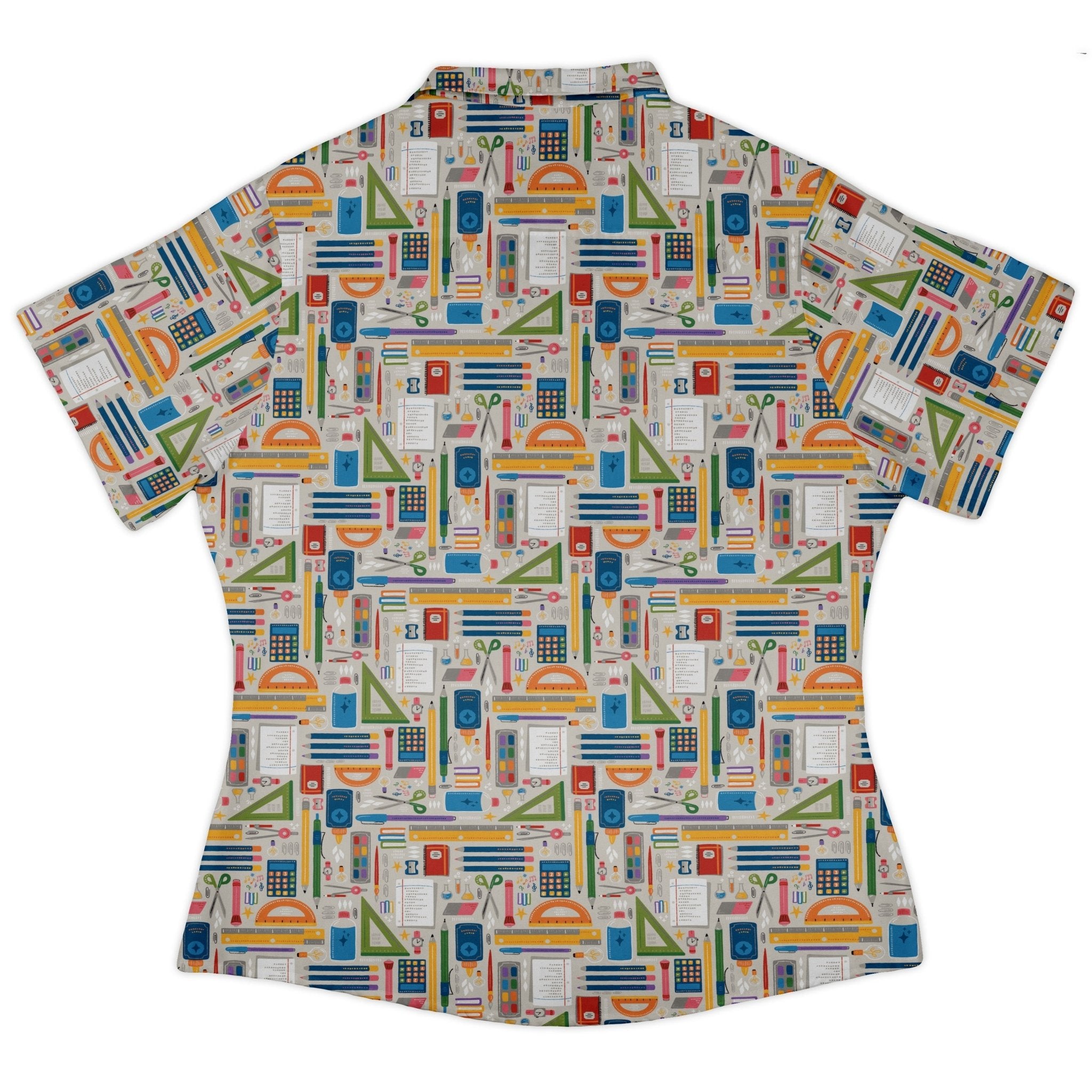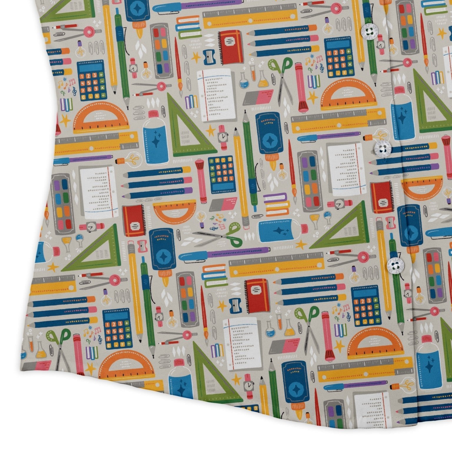 The Teacher Student Supplies Curvy Button Up Shirt schools your wardrobe with a gallery of classroom icons—from math to science—designed by Zirkus Design. Cut to flatter curves with a clean, untucked silhouette, it pairs faculty-level polish with all-day comfort. The all-over print looks crisp and cohesive, pocket included, and signature buttons add a smart finish. Artist-backed and printed with eco-minded inks, it’s ready for office hours, labs, and life between.