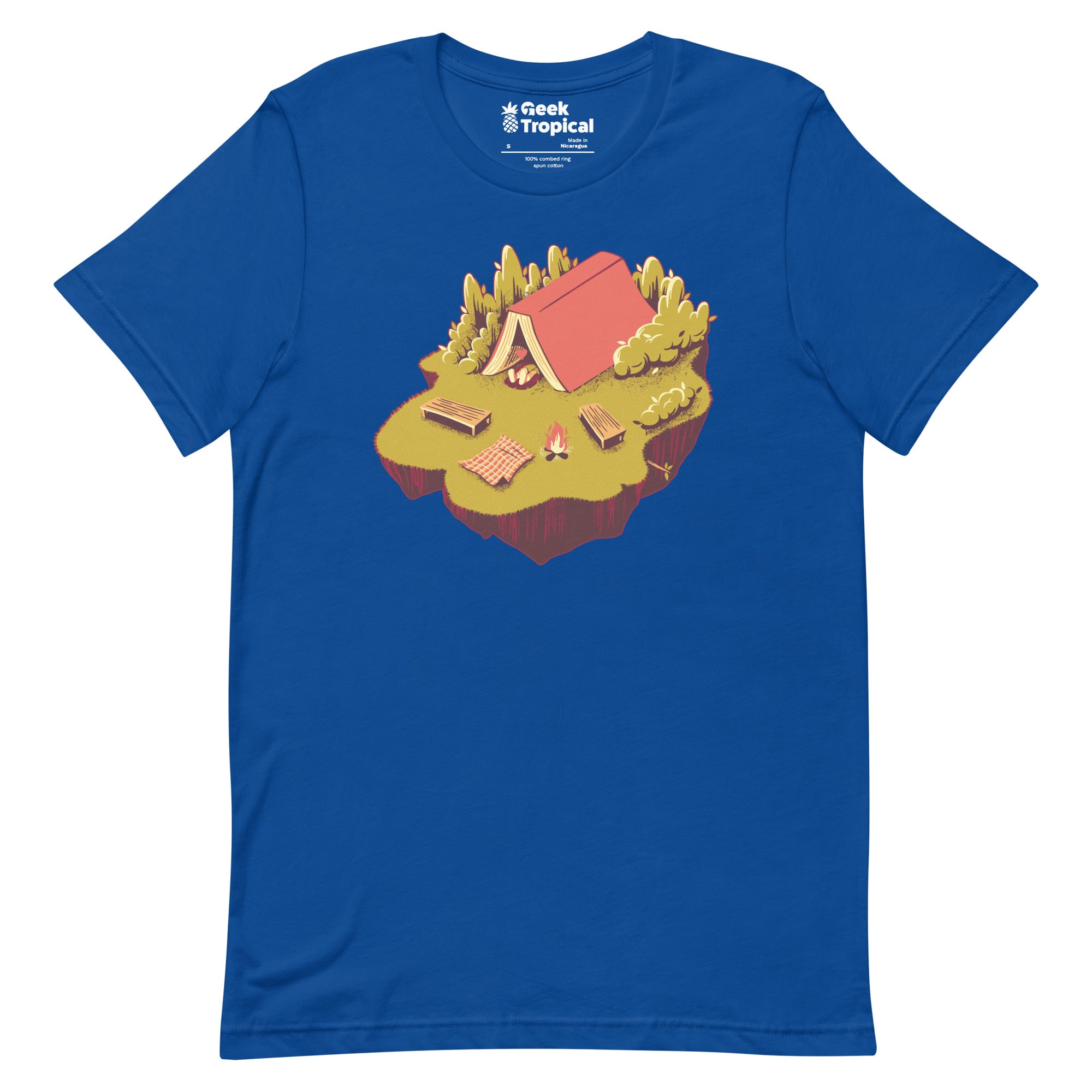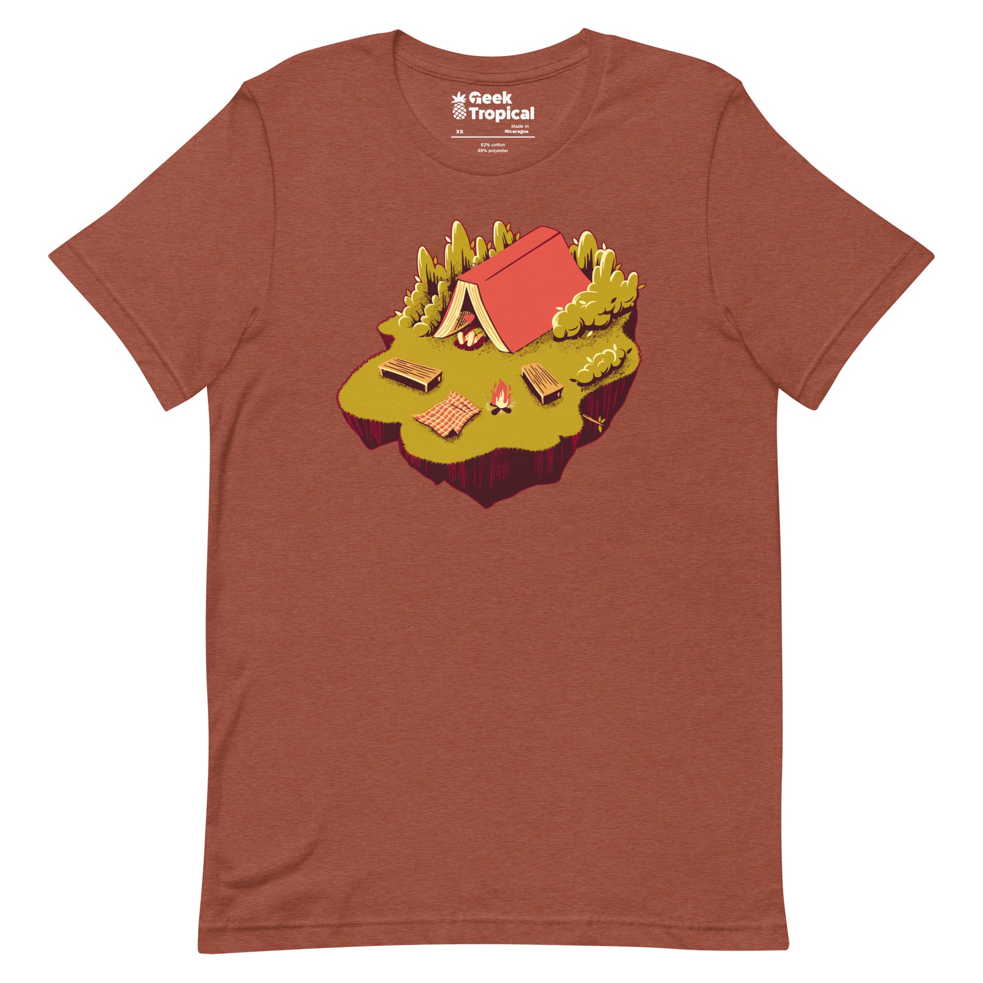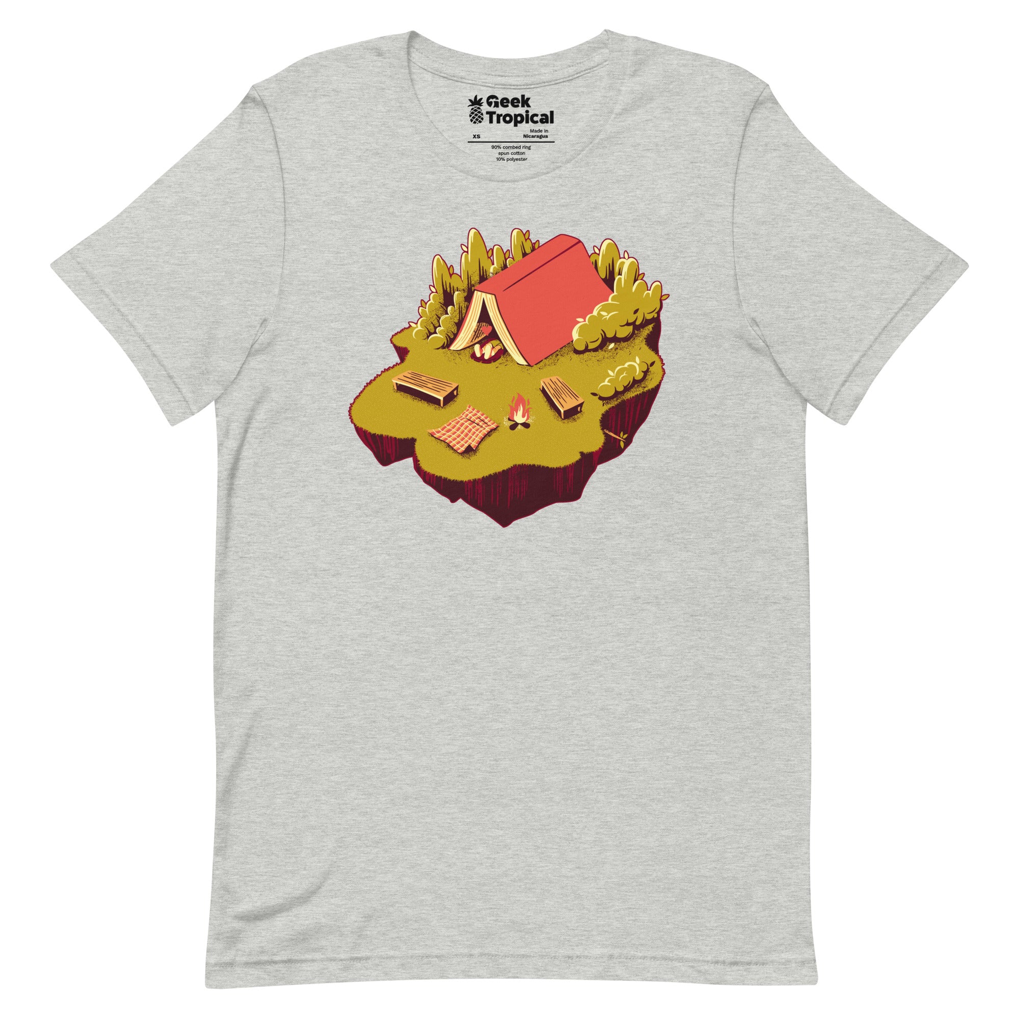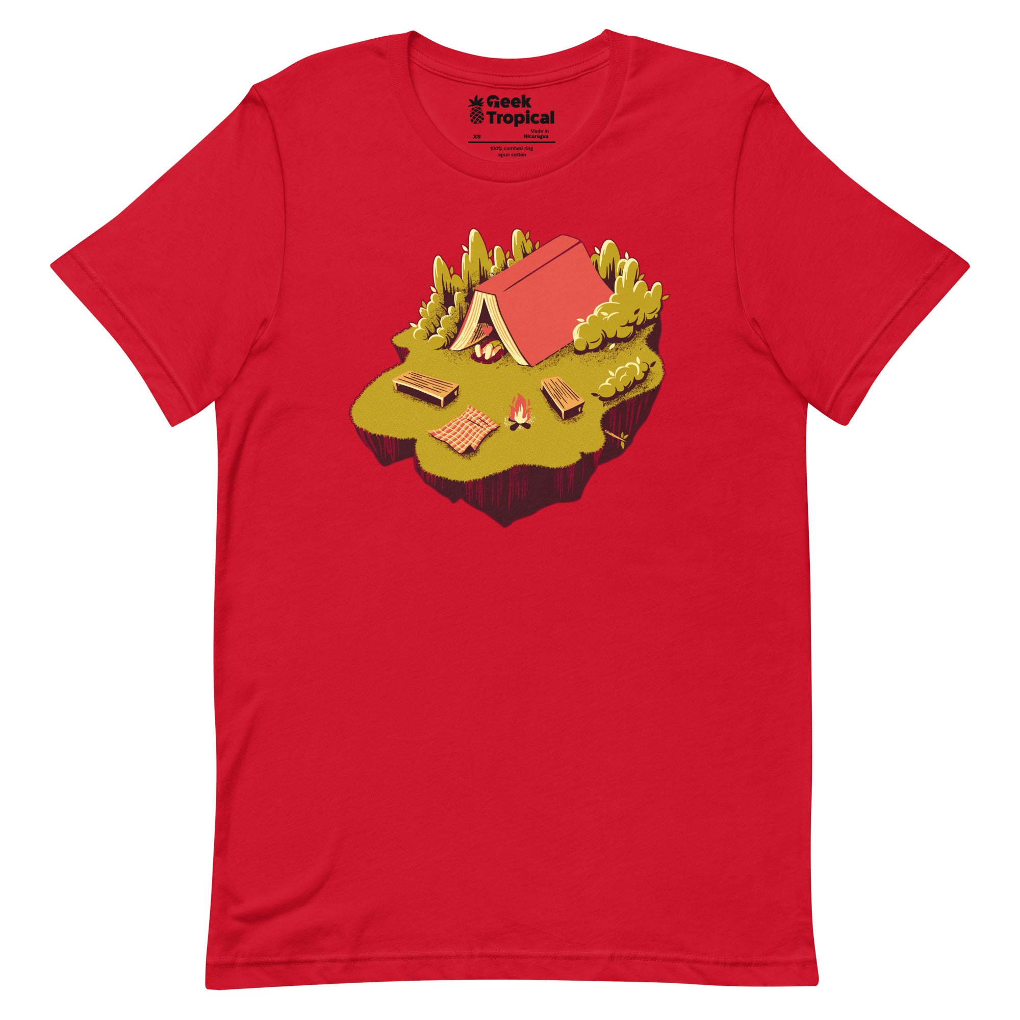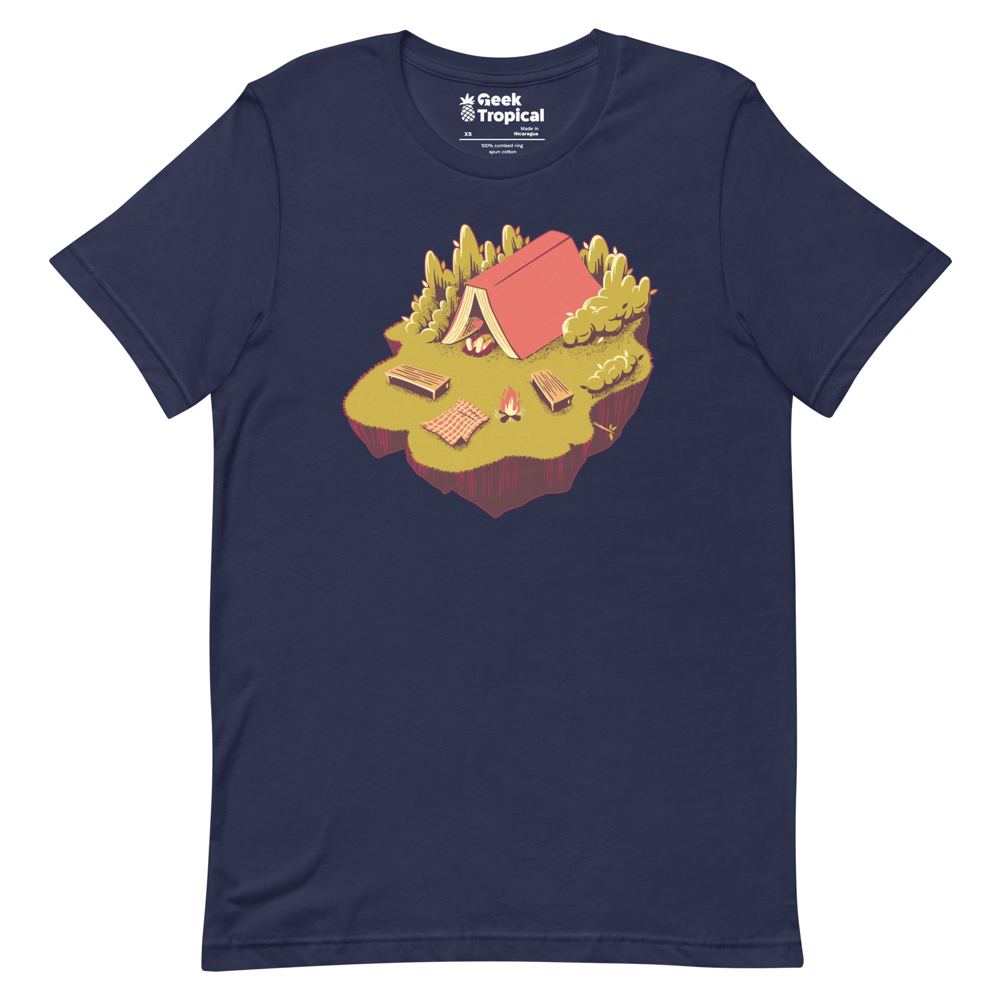 The Camping with a Book T-Shirt unites trail vibes with page-turning bliss. Designed by Tobe Fonseca, the print reveals a peaceful campsite unfolding from an open book—pages shaping the ground as a snug scene settles in, drawn with crisp lines and story-soaked texture. For readers who pack novels next to their compass, this artist-backed tee keeps your fandom subtle, clever, and eco‑minded from library stacks to weekend getaways.