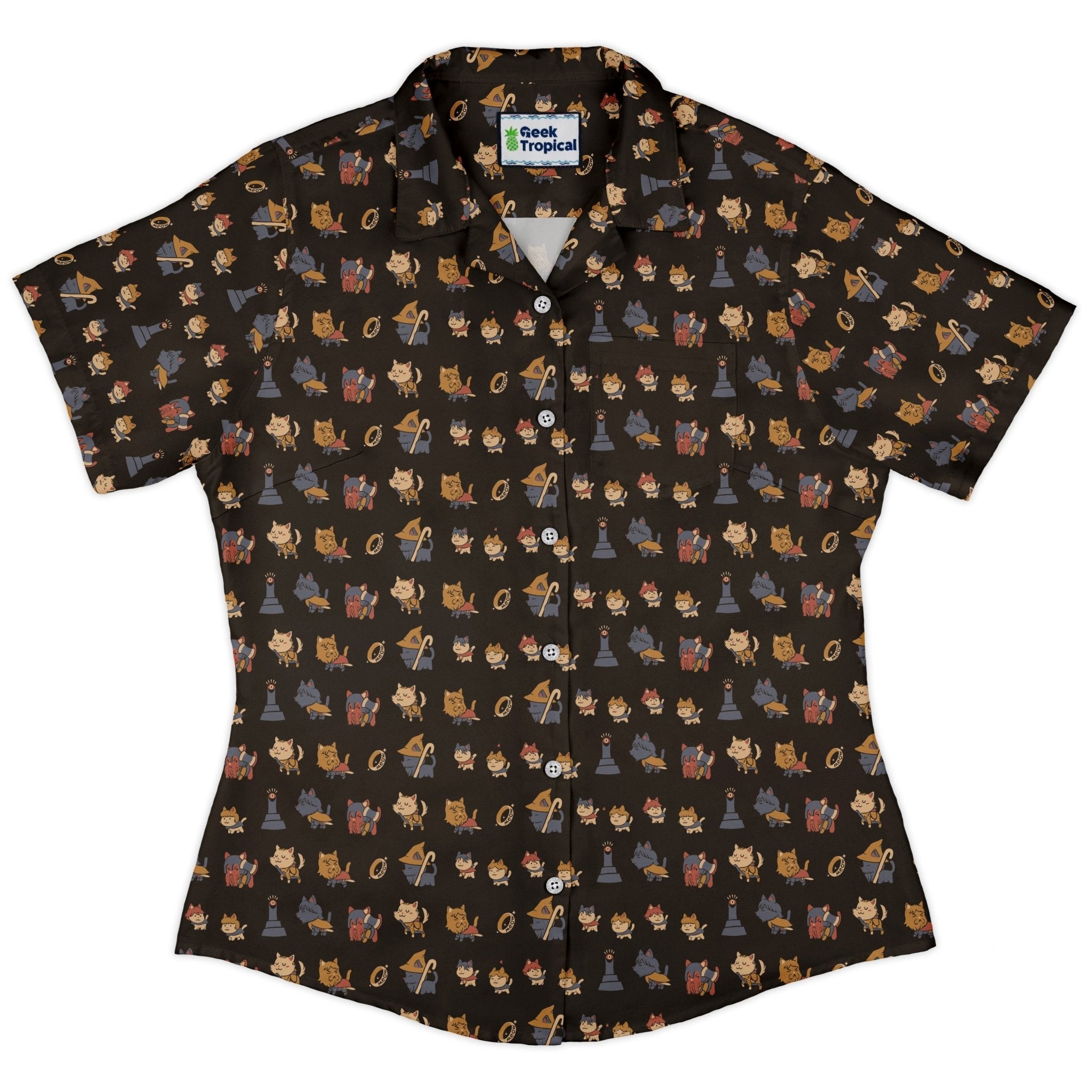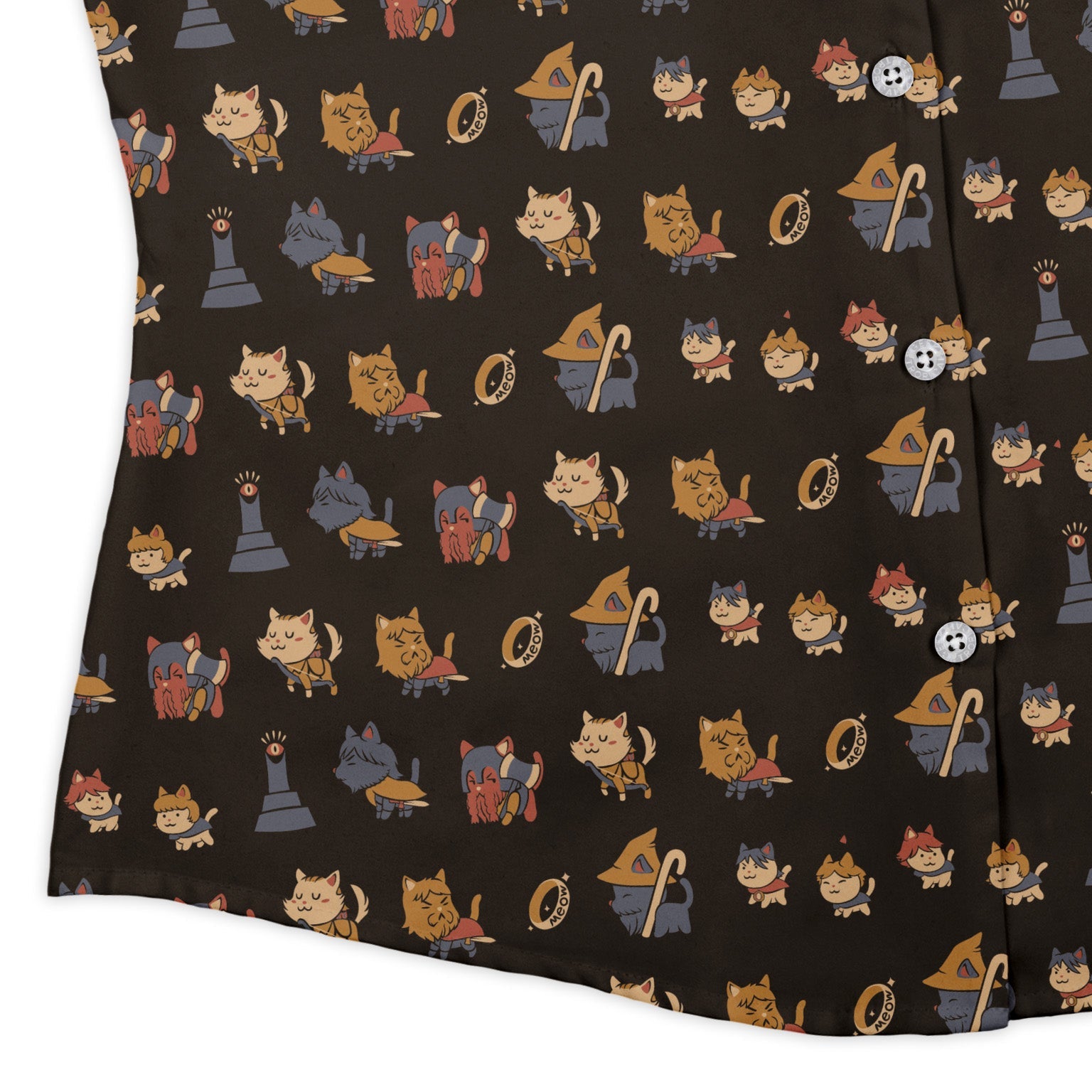 The Furrlowship of the Ring Curvy Button Up Shirt rallies a fuzzy fellowship for an epic quest, designed by Tobe Fonseca with playful fantasy flair. The all-over print lines up across the front and pocket, spotlighting ring-centric motifs and charming animal adventurers. Cut to flatter curves with an easy, untucked vibe, it keeps you comfy and uses eco-minded inks—geek style, artist-backed. Dress it up or roll the sleeves for casual quests.