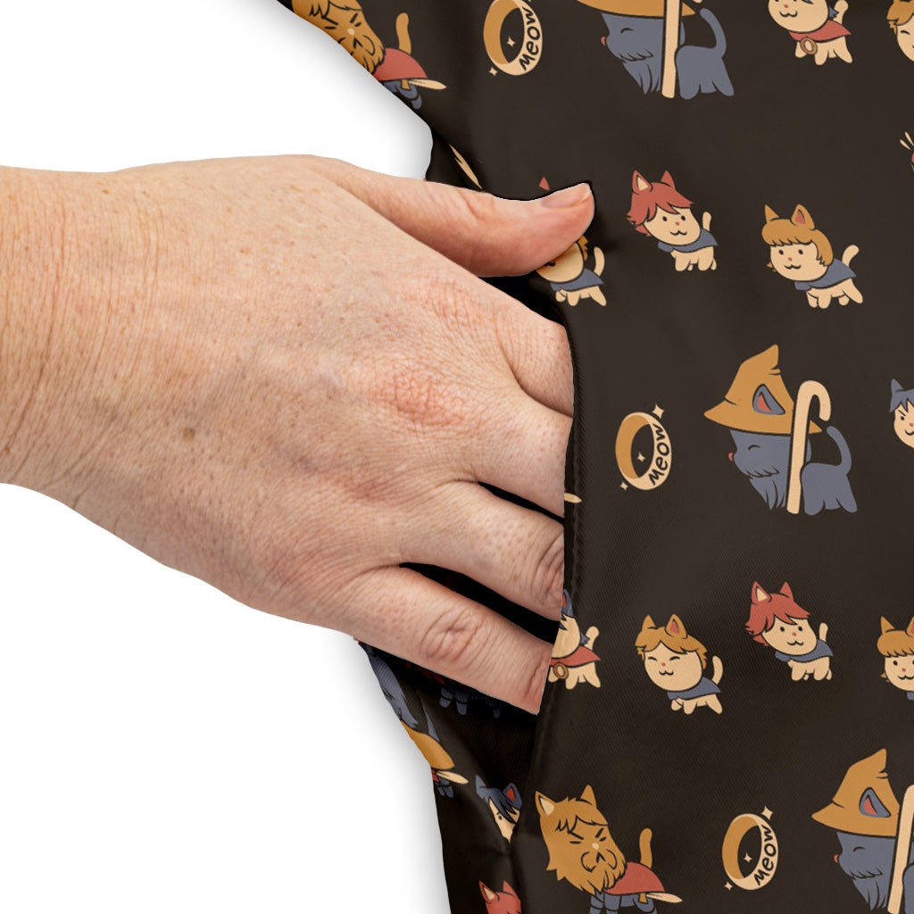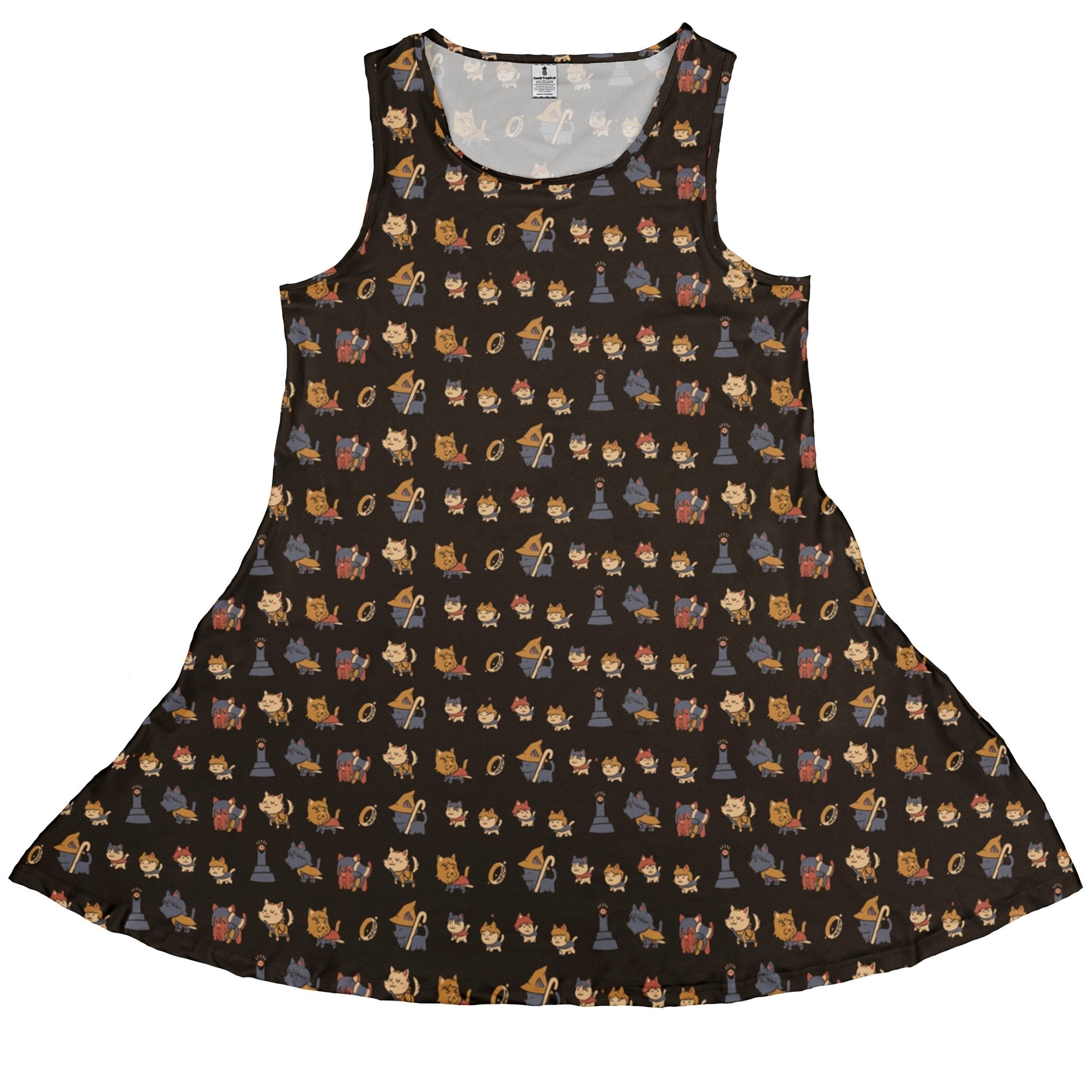 The Furrlowship Of The Ring Dress assembles a furry fellowship on a trek beneath a glowing ring, illustrated in bold contrast by Tobe Fonseca. The art sets an epic tone up front, while the dress keeps it effortless with a soft drape, trustworthy coverage, and pockets that actually fit a game controller. Easy to style for cons, coffee runs, or second breakfasts—and every purchase champions the artist behind the magic.