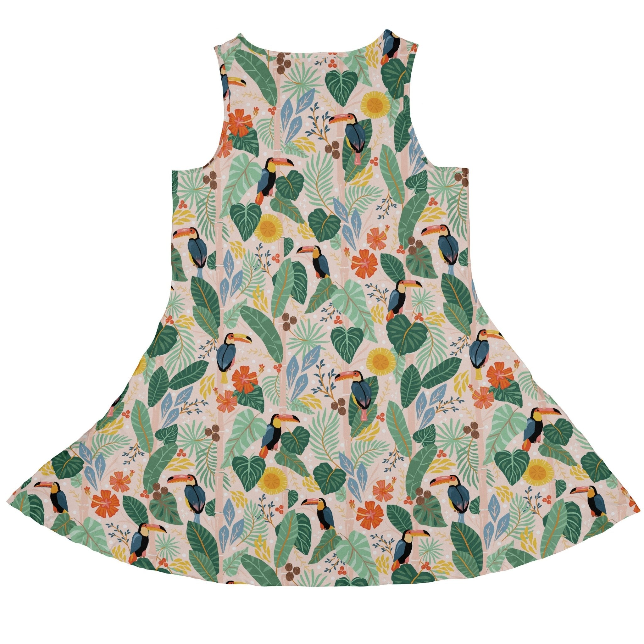 Meet the Toucan Tropica Dress, your shortcut to vacation-level vibes with nerd-level practicality. An allover print of bold toucans nestled among lush botanicals pops across a clean, modern silhouette. Smooth, breathable fabric moves with you, and yes—there are real pockets that actually hold stuff. Styled for effortless polish, powered by art from Zirkus Design, and ready for con halls, coffee runs, and tropical daydreams.