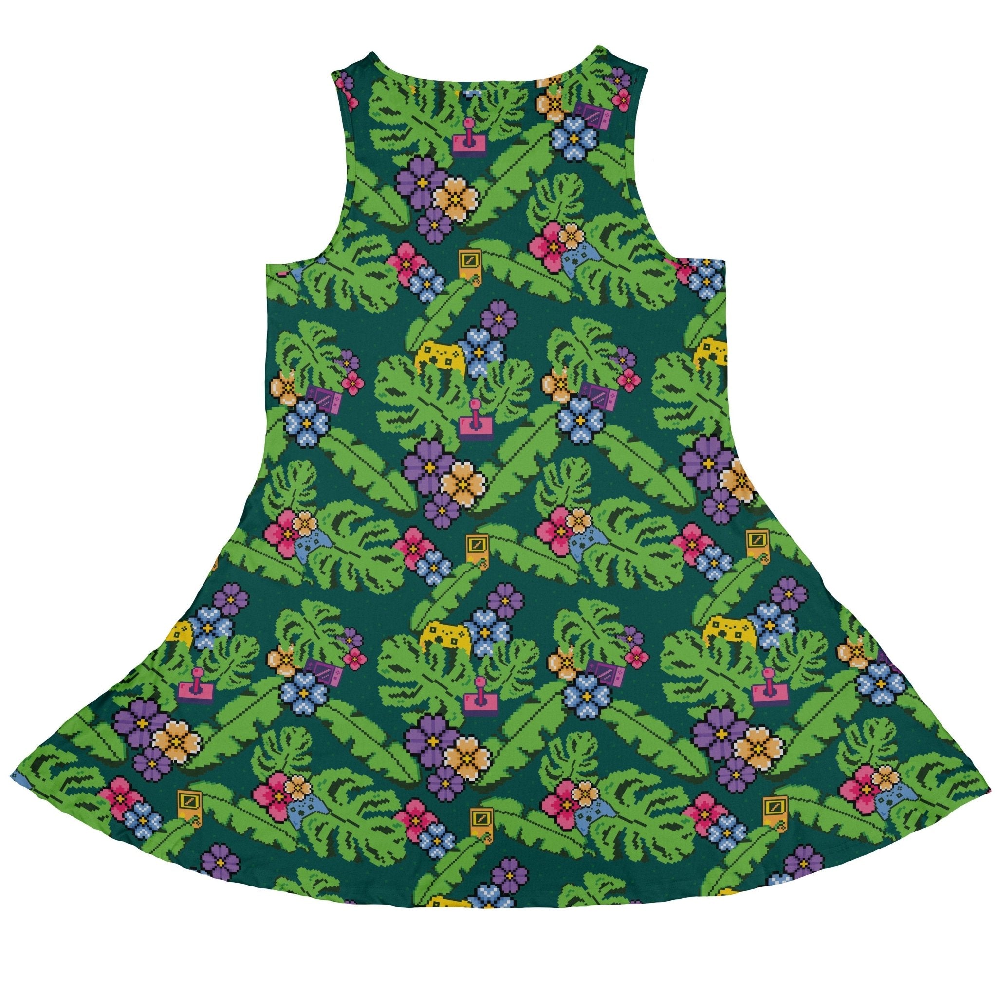 Meet the Tropical Video Game Pixels Dress, where beach vibes meet arcade art. Designed by Dunking Toast, this all-over tropical pixel print blends Hawaiian-shirt energy with nerdy nostalgia in sunny brights and deep tones. Easy to wear, polished enough for date night, and practical with pockets. From beach strolls to con halls, it’s your player‑one uniform—and it supports licensed artists.
