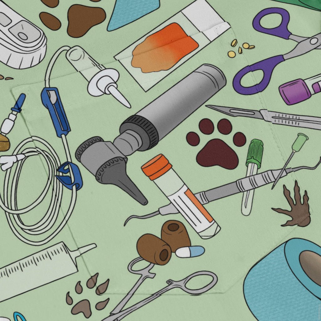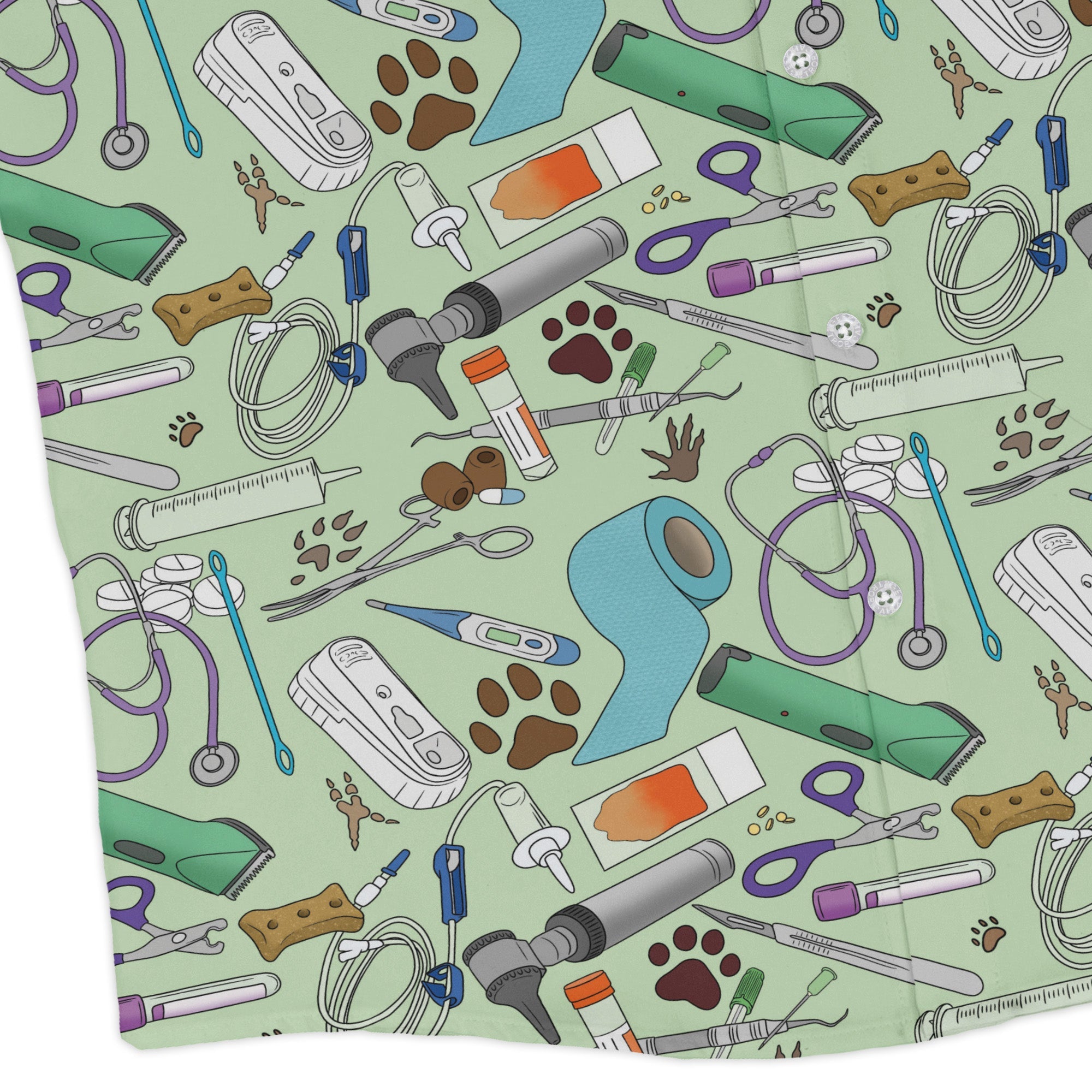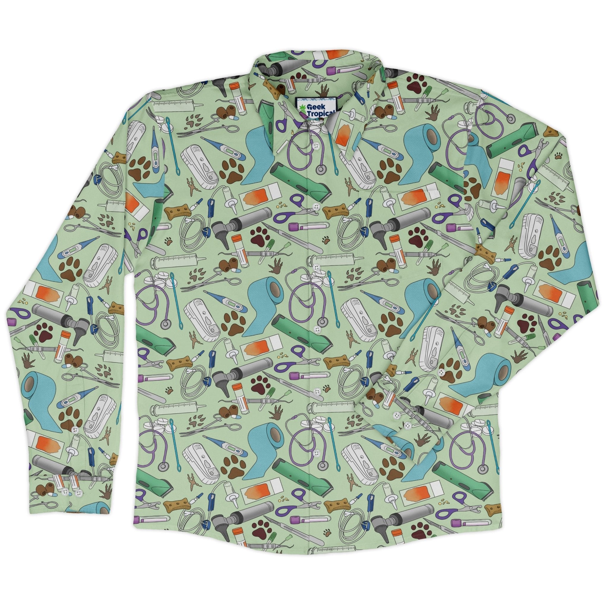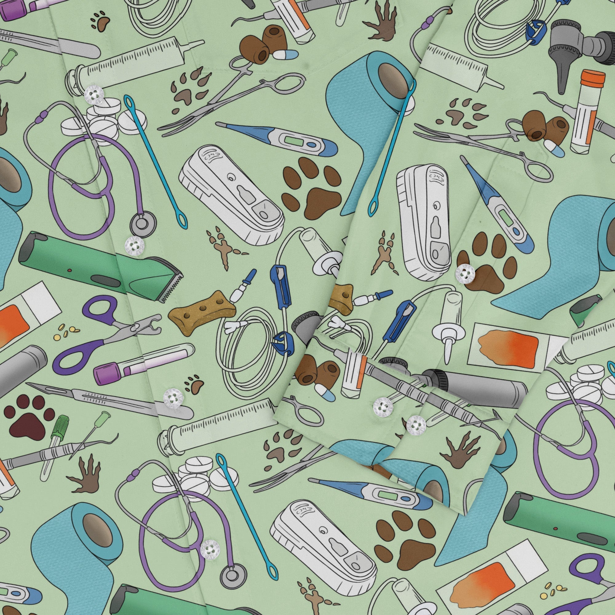 Meet the Vet Tech Long Sleeve Button Up Shirt—an art-forward button up celebrating the humans who speak fluent meow, woof, and science. Designed by Julie Kitzes, its all-over veterinary motif blends charming critters with clean clinical linework, and the print even flows right across the chest pocket. Soft, breathable, and shift-to-weekend ready, this unisex staple uses eco-conscious inks and crisp buttons for a polished, nerdy vibe.