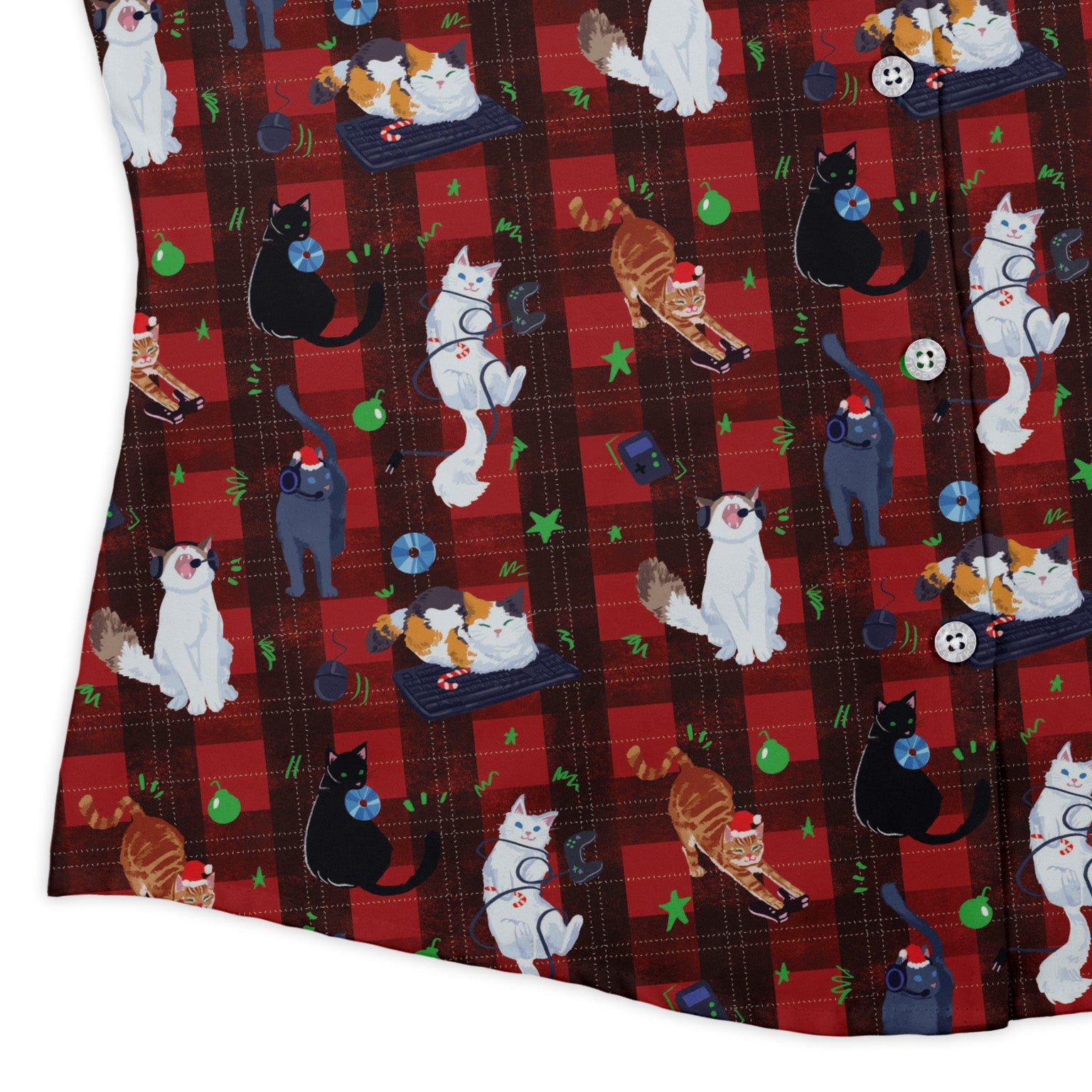 Meet the Video Game Cats Christmas Curvy Button Up Shirt, a festive mashup where gamer wit meets feline mischief. Designed by Claire Murphy, the allover arcade-inspired print showcases playful cats weaving through holiday motifs, leveling up your seasonal style. Cut for curves with an easy untucked drape and adjustable sleeves. The pattern aligns across the placket and pocket, topped with branded buttons. Printed with eco-conscious inks for all-day play.