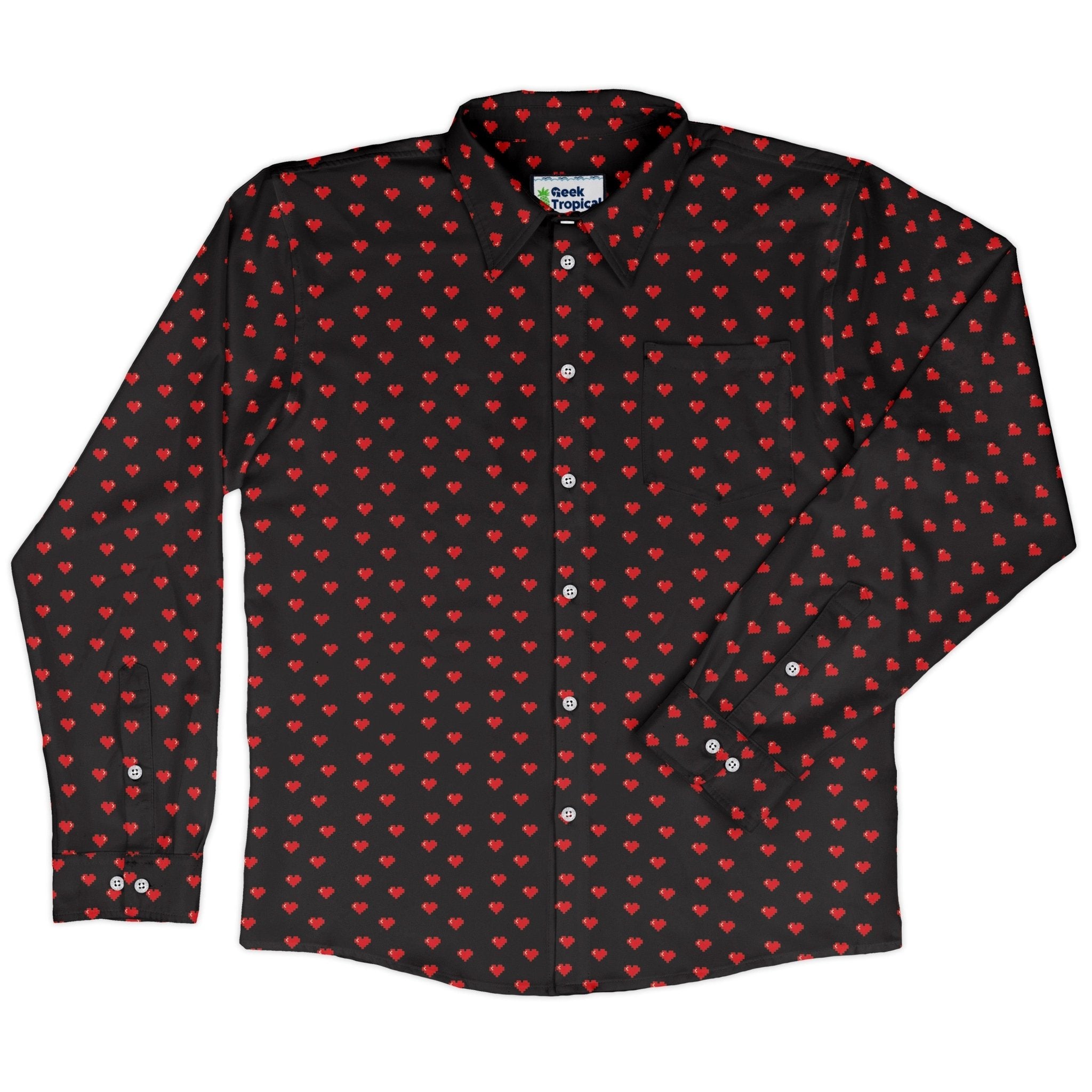 The Video Game Hearts Black Long Sleeve Button Up Shirt levels up your look with an allover field of pixel hearts on deep black—subtle enough for the office, nerdy enough for raids. Designed by Heather Davenport, the crisp arcade-inspired pattern keeps things clean and modern while quietly flexing your fandom. Dress it up or down; either way, you’re signaling extra lives in style, printed with eco‑conscious inks.