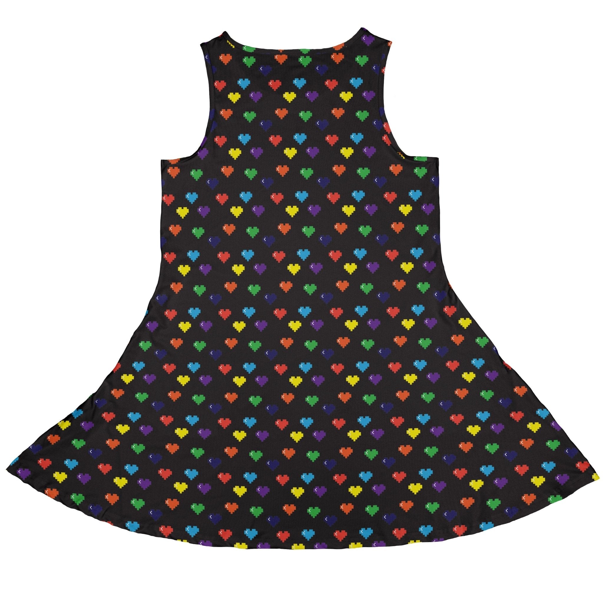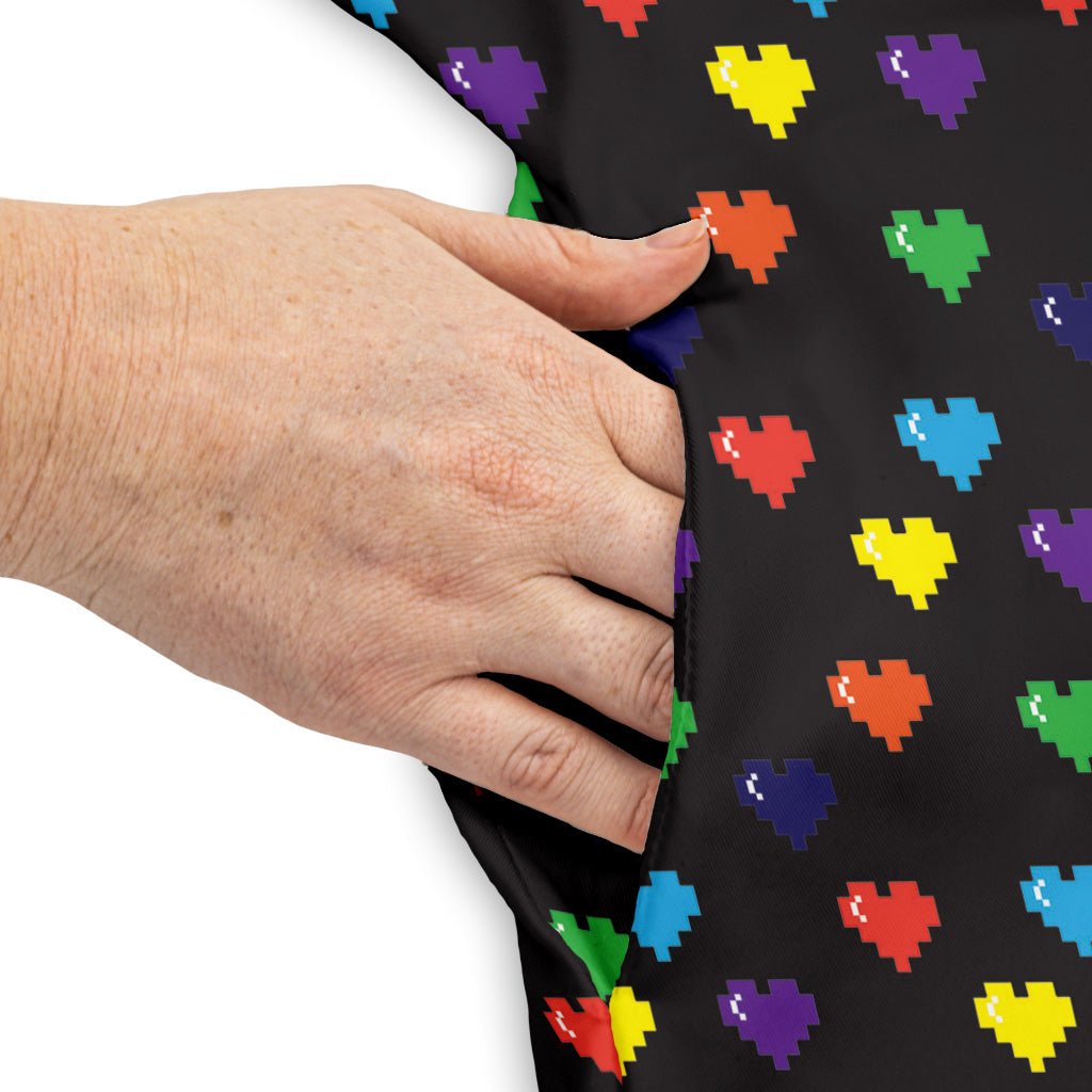 The Video Game LGBTQ+ Pride Hearts Dress levels up your look with retro arcade energy and unapologetic color. Rows of pixel hearts in Pride hues pop against a deep black backdrop—think in-game life bar from afar, bold art up close. Smooth, opaque drape keeps it easy to style from con day to date night. Real pockets hold a controller or phone. Designed by Heather Davenport, this artist-backed piece lets you press start on everyday pride.