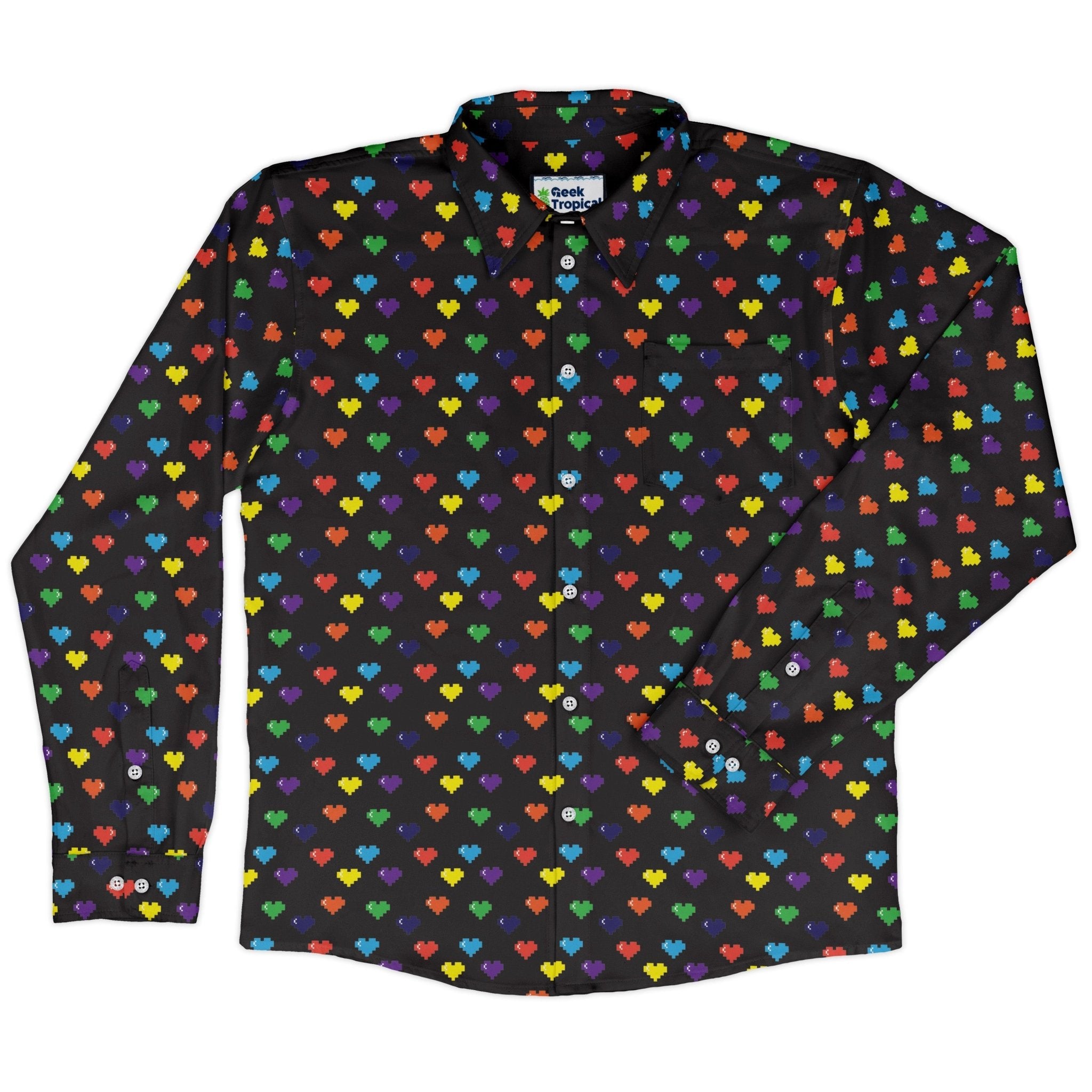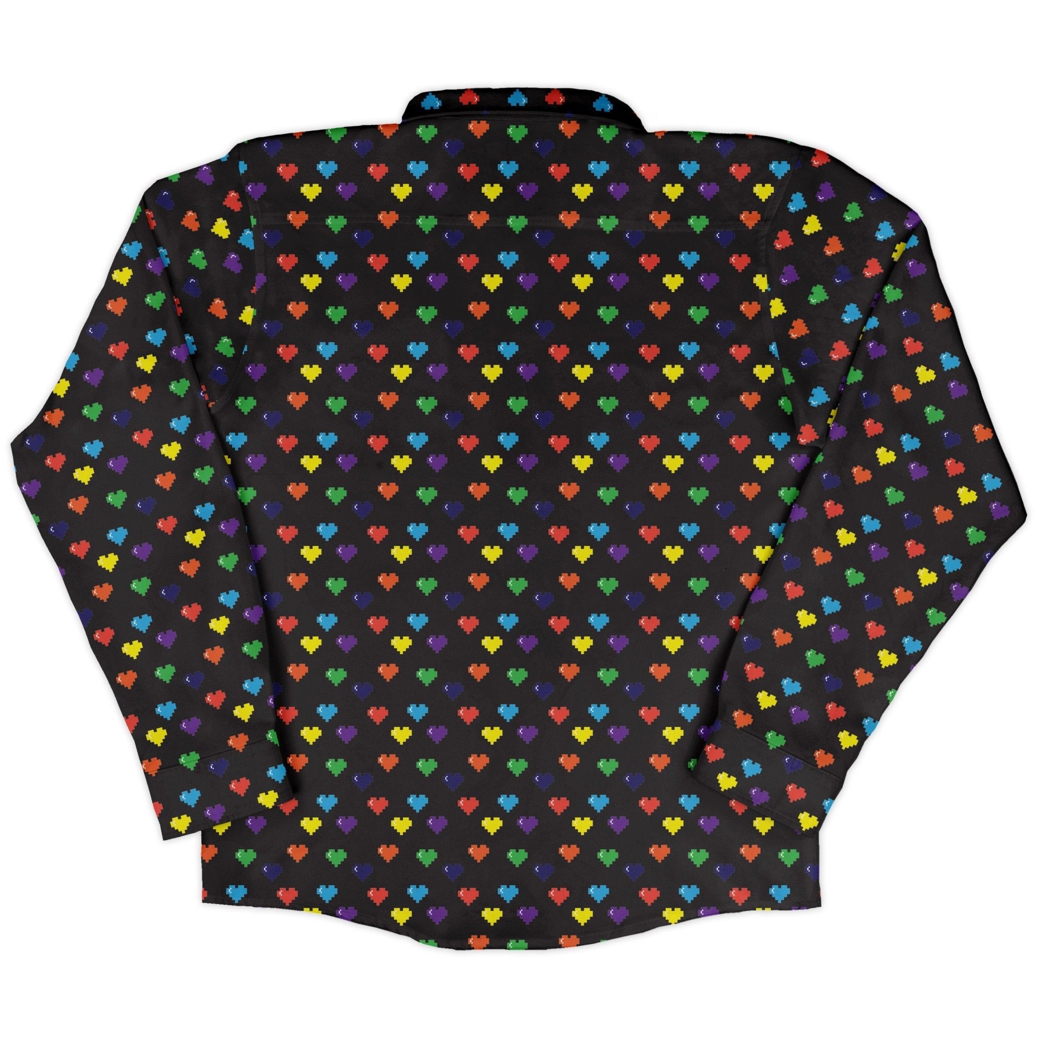 Level up your fit with the Video Game LGBTQ+ Pride Hearts Long Sleeve Button Up Shirt. An all-over field of pixel hearts in Pride colors channels classic arcade lives, wrapping from collar to cuff with a clean, continuous look across the front. Crisp, wearable, and unapologetically queer, it moves from con floor to casual Friday without missing a beat. Designed by Heather Davenport and artist-backed.