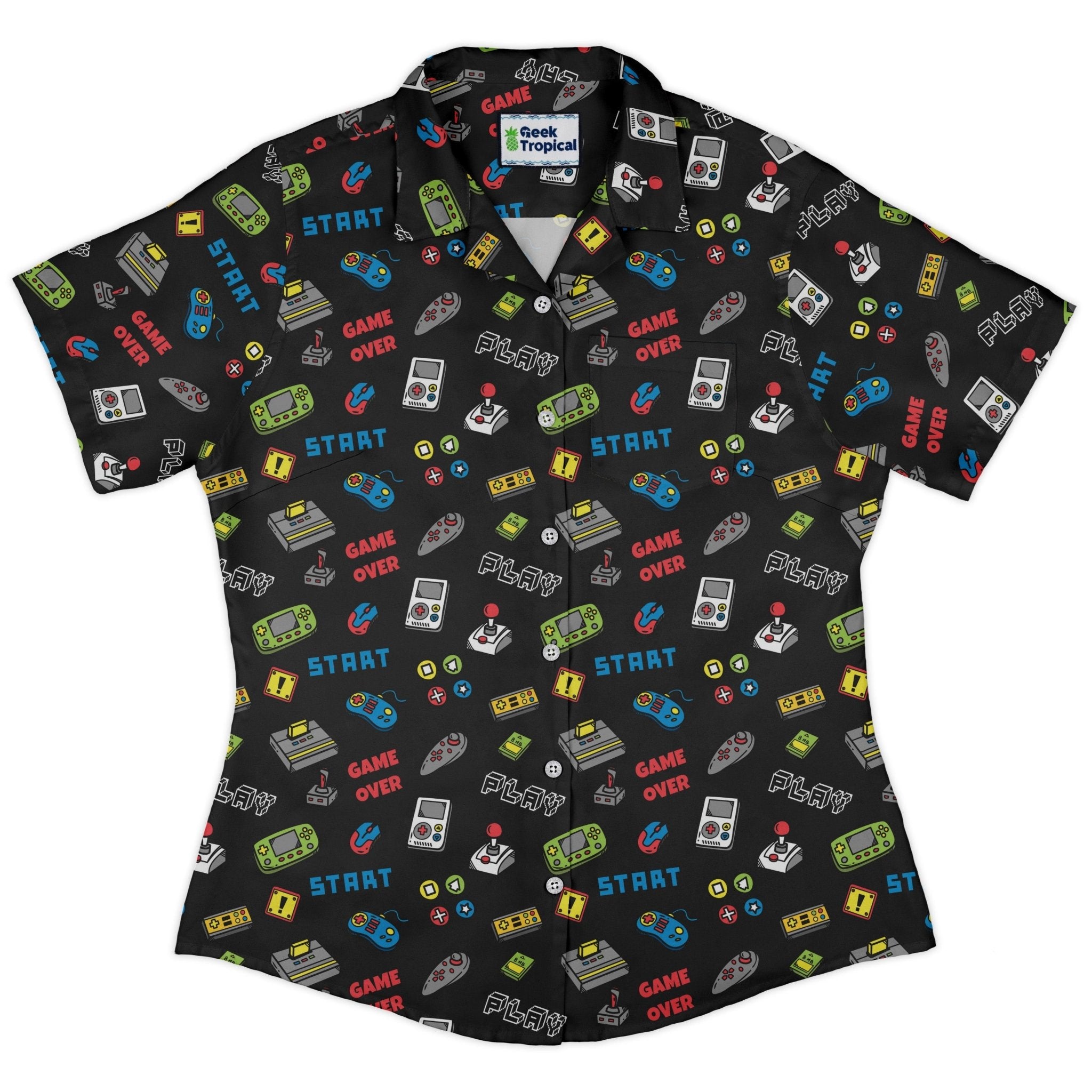 Press start on style with the Video Gamer Black Video Game Curvy Button Up Shirt. A sleek black base showcases a vibrant all-over arcade print with bold, pixel-inspired motifs, while the art lines up cleanly across the chest pocket for a seamless finish. Cut for curves with smart, adjustable sleeves and an easy-to-untuck hem, it levels up comfort and polish. Printed with eco-conscious inks and artist-backed—your wardrobe gets the high score.