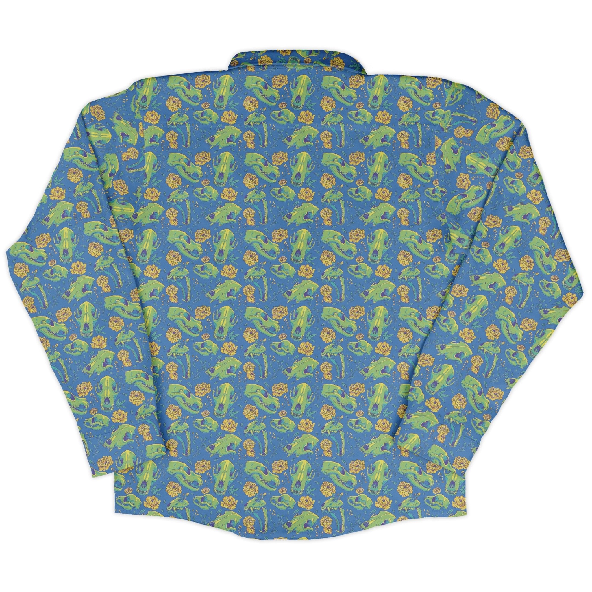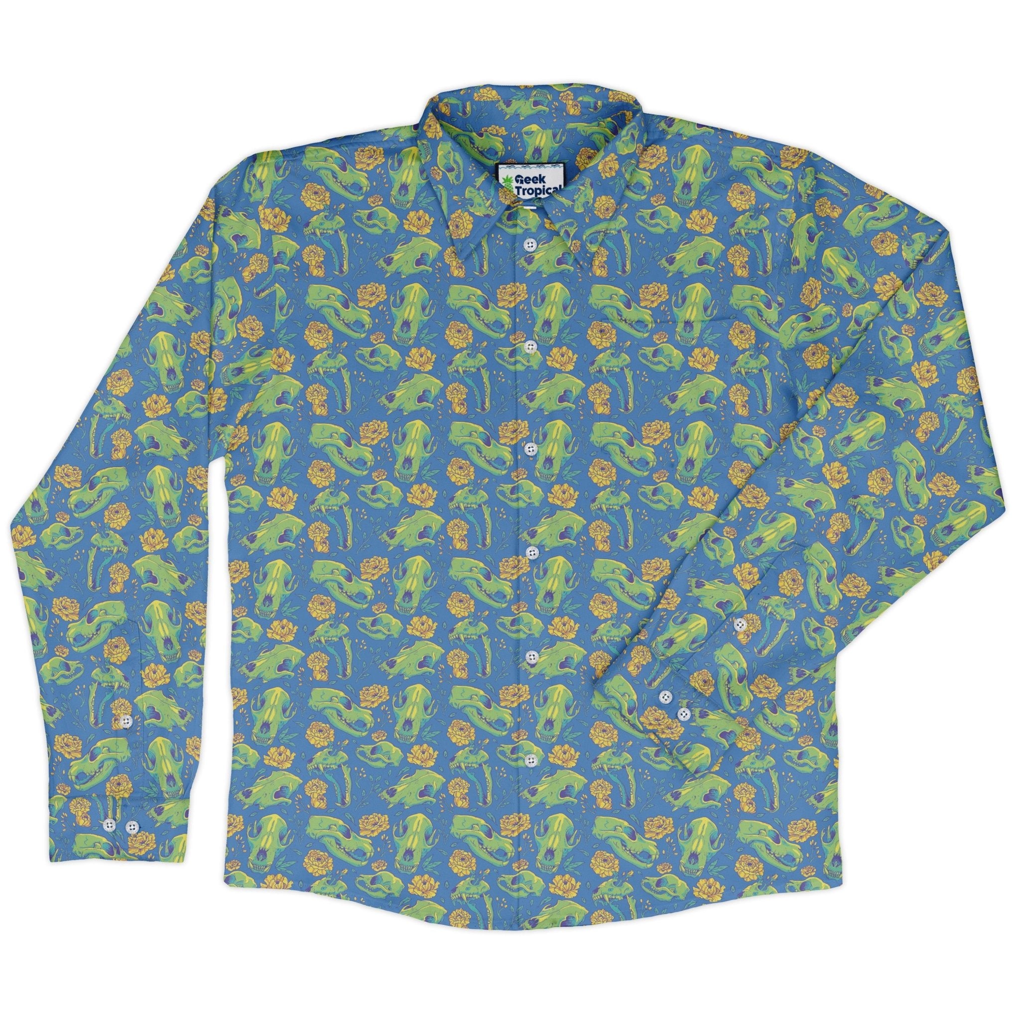 The Wildfang Flora Blue Long Sleeve Button Up Shirt is your wearable field guide: a deep-blue canvas alive with lush botanicals and playful animal cameos, designed by Julie Kitzes. Clean lines and a matched chest pocket keep the artwork flowing across the front; polished buttons and long sleeves finish the look. Feels light and easy for all-day quests, with an adult-sized fit that moves from office to after-hours. Printed with eco-conscious inks and artist-backed style.