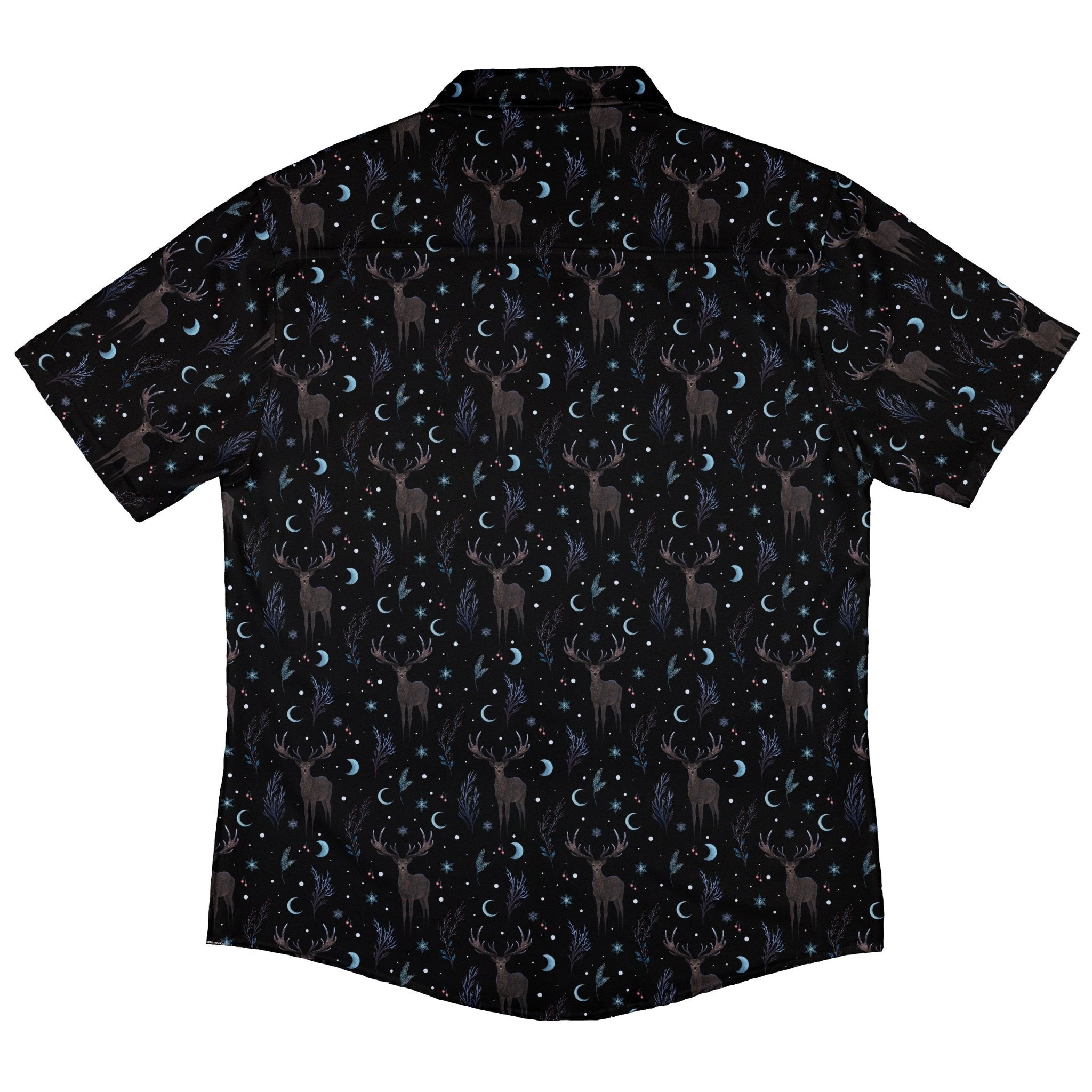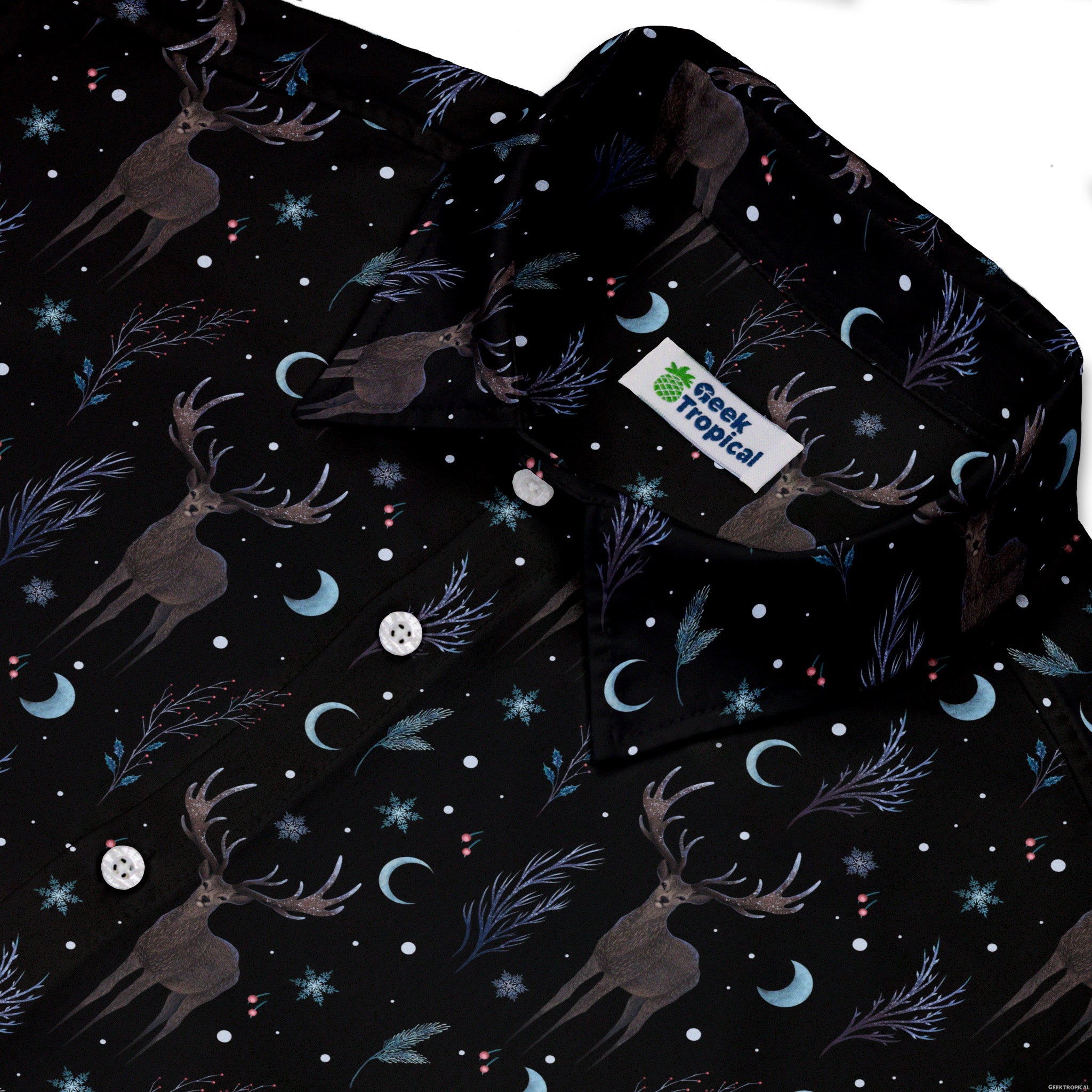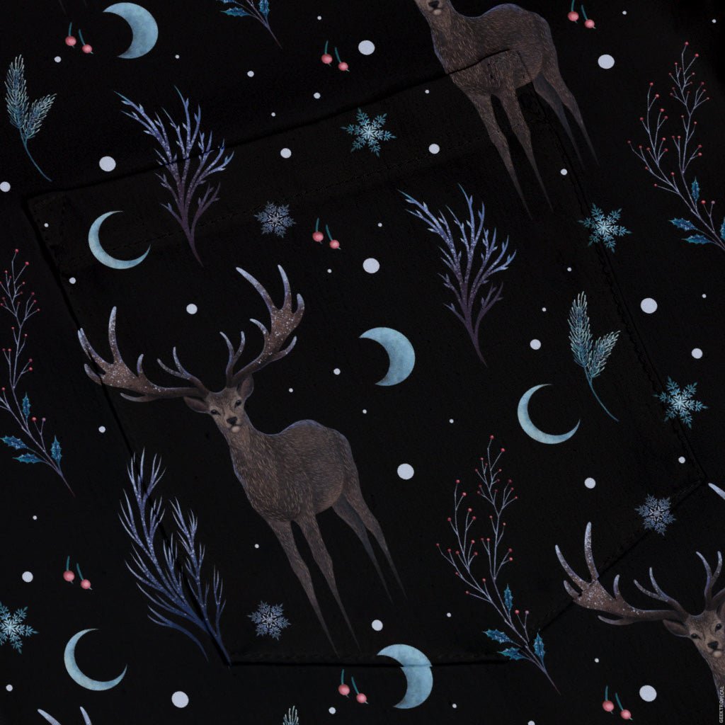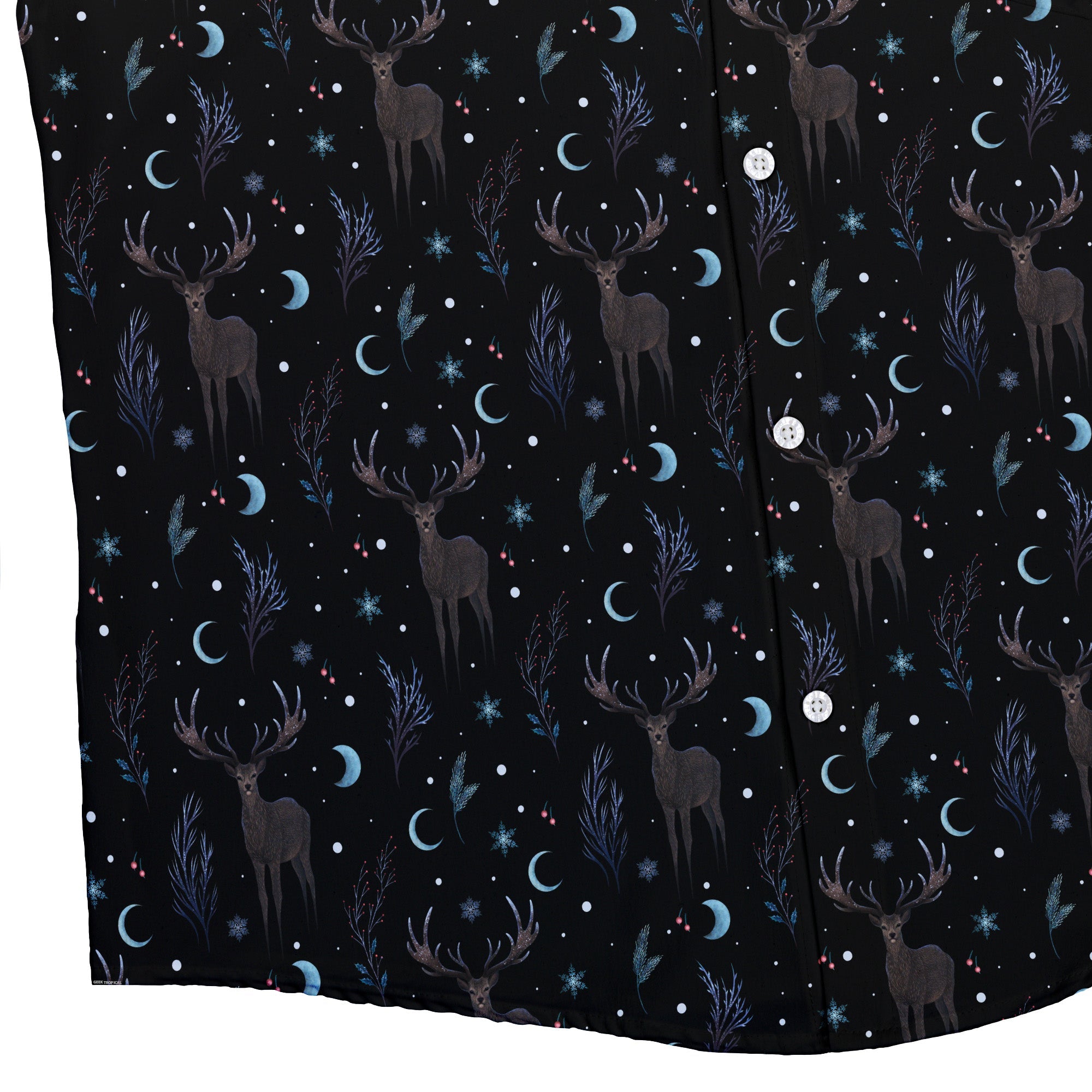 Meet the Winter Deer Button Up Shirt — a playful, polished nod to cozy season. Illustrated deer wander through snow-dusted evergreens and botanical sprigs, sprinkled with quiet flakes in cool blues, pine greens, and berry reds. The vibe is festive, not flashy, so it carries beyond the holidays. Designed by Episodic and artist-backed, it’s ready for office hours, game nights, and cocoa-fueled strolls.