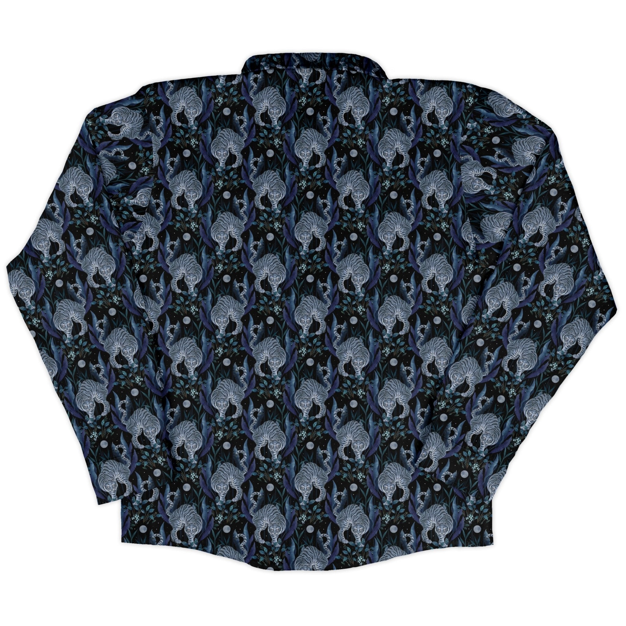 Meet the Year of the Tiger Blue Long Sleeve Button Up Shirt—equal parts fierce and refined. A rich cobalt ground sets off prowling amber tigers, cream blooms, and leafy fronds in a crisp, allover repeat that flows cleanly across the chest pocket. Designed by Episodic, this artist-backed button-up blends smart, geeky flair with everyday polish. Soft and breathable, finished with nerd-approved details and printed with eco‑conscious inks.
