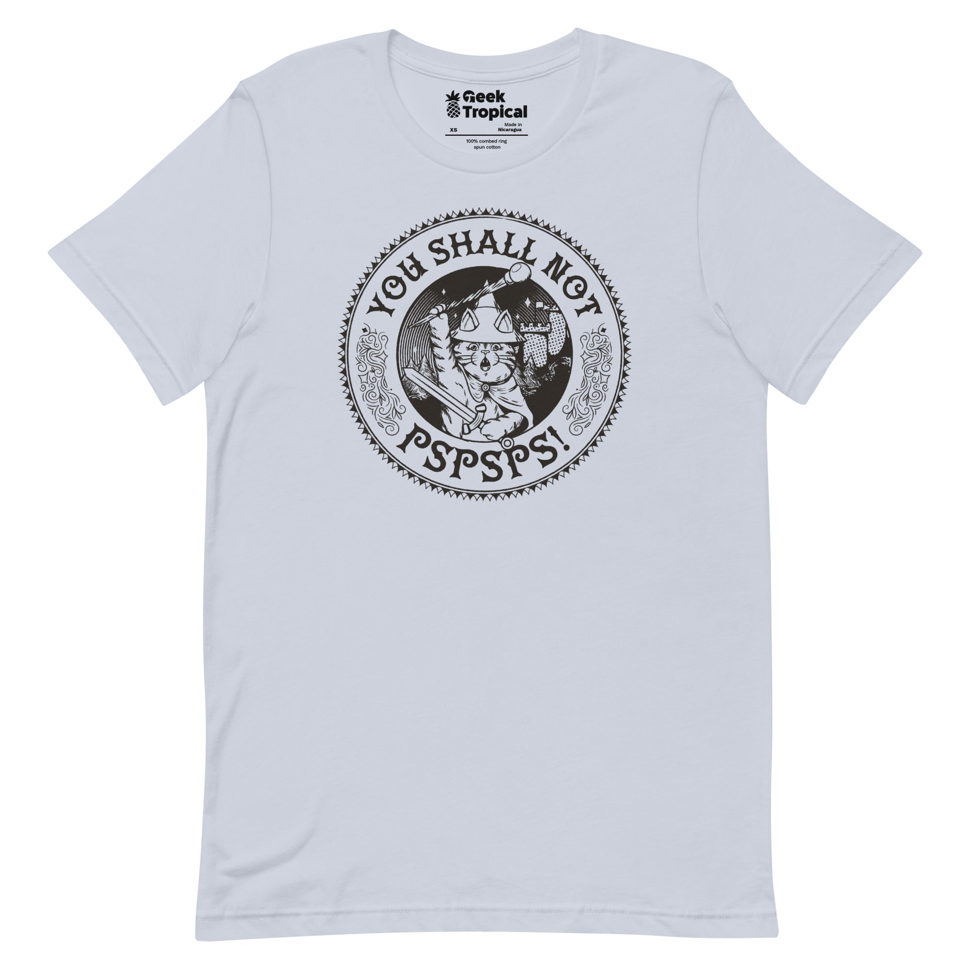 The You Shall Not Pspsps Funny Cat T-Shirt turns a legendary line into feline law. Designed by Tobe Fonseca, the artwork spotlights a steadfast kitty in full fantasy drama while bold lettering lays down the no‑pspsps rule. A playful pick for cat guardians, meme lovers, and Dnd parties, it’s comfy for daily wear and printed with eco‑conscious inks—licensed art that supports the creator with every order.