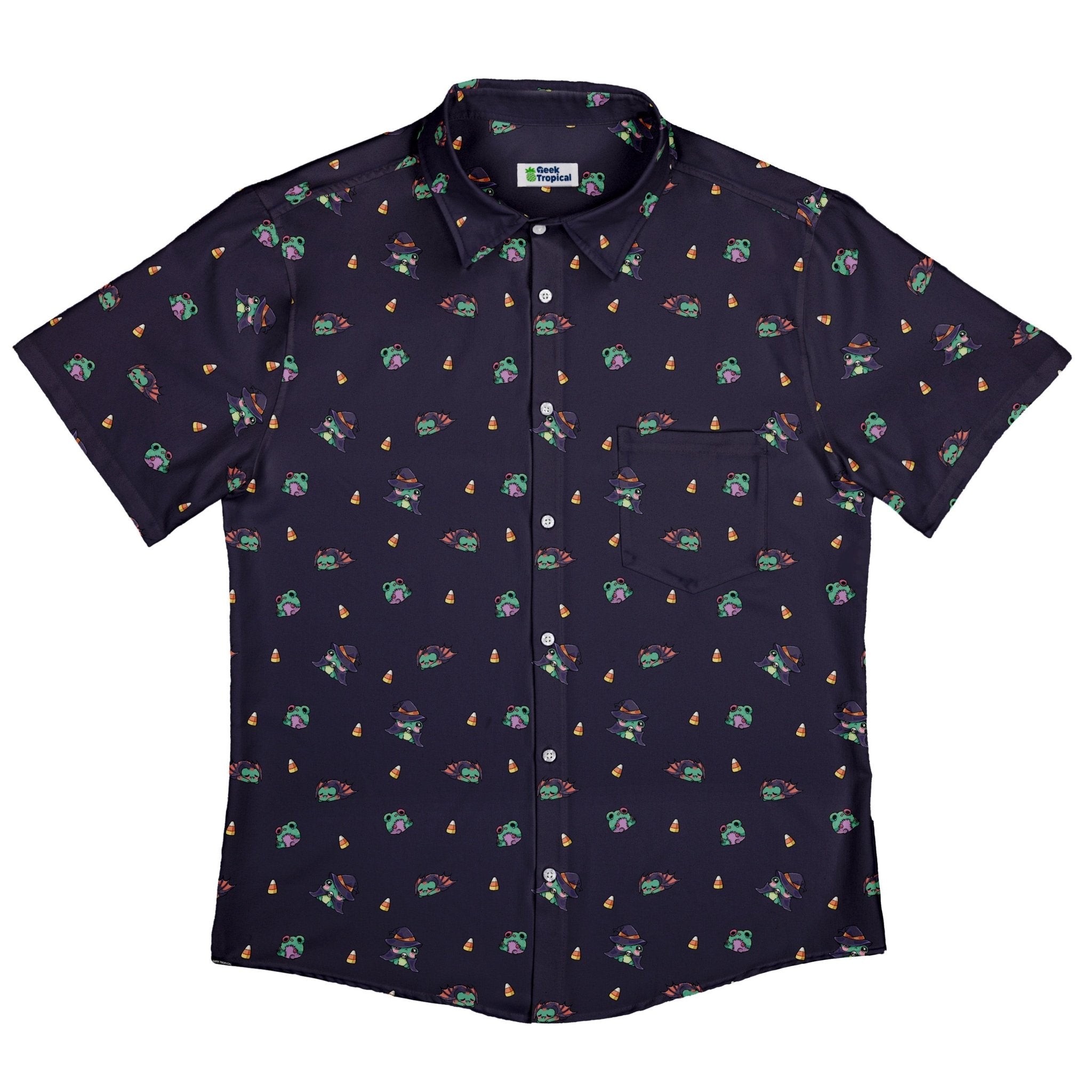 Meet the Zombie Frogs Button Up Shirt, your low-key flex for spooky season and beyond. An all-over swarm of undead amphibians leaps across the fabric in high-contrast greens and inky shadows, giving creepy-cute energy without screaming for attention. The artwork lines up cleanly across the placket for a polished look, and the optional chest pocket keeps the pattern flowing. Designed by Ardi Tong and artist-backed, it’s Halloween-ready streetwear with geek cred.
